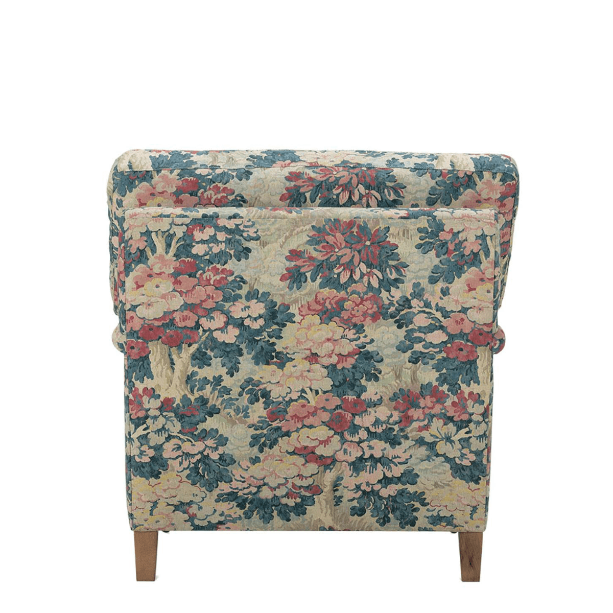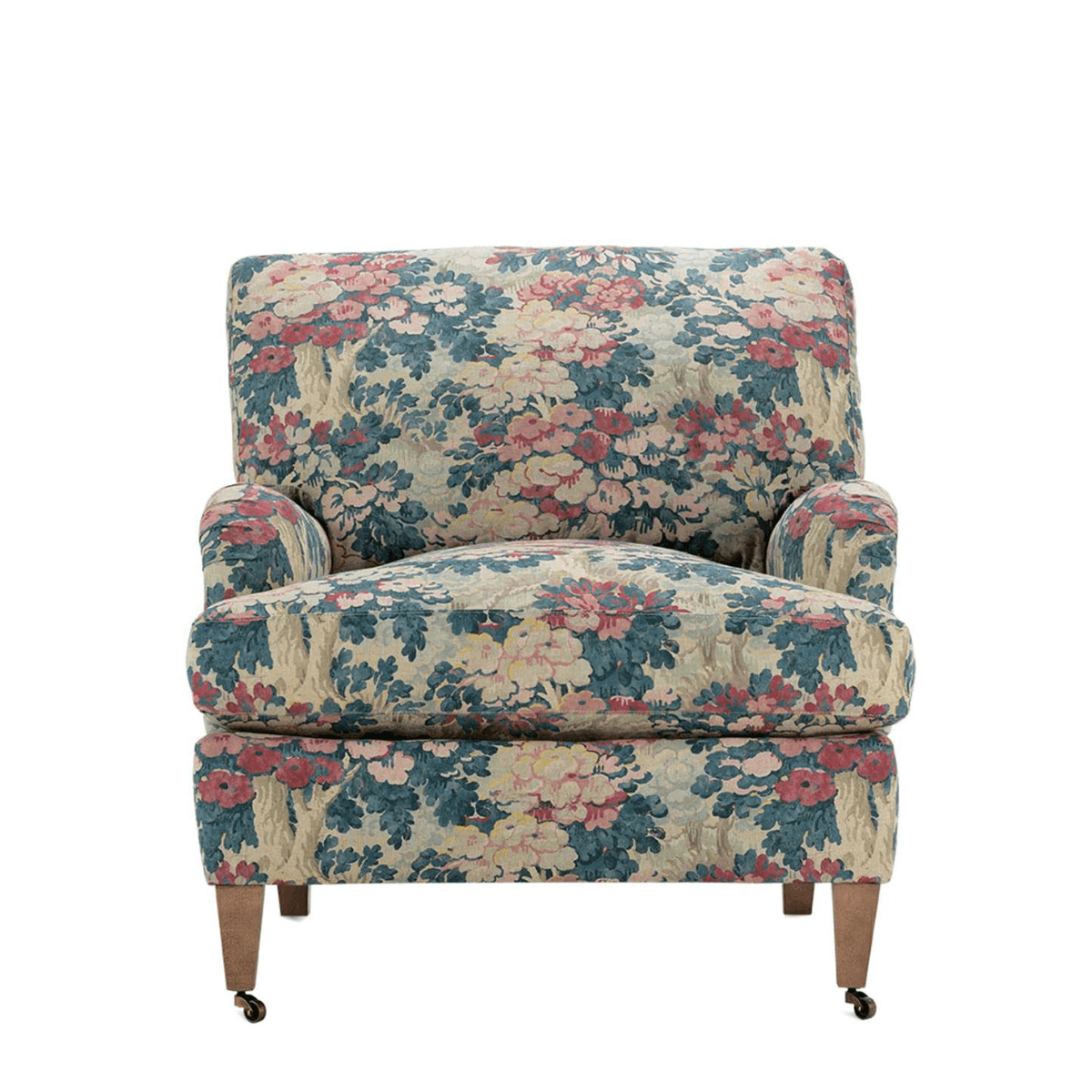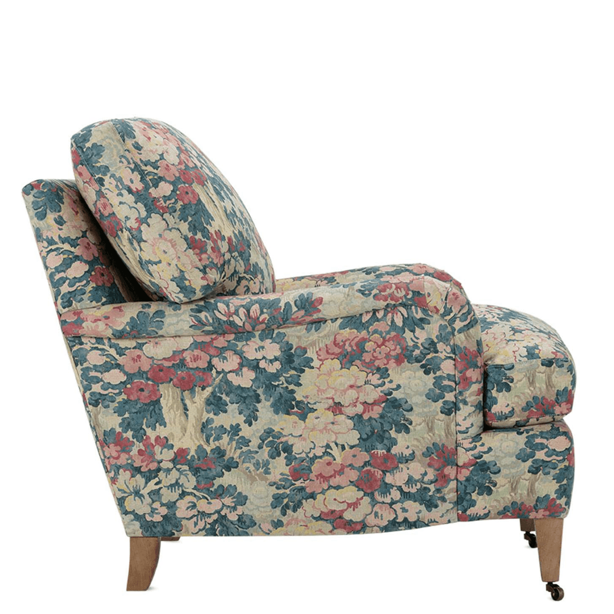 Handcrafted in Virginia, the Bromley Floral Chair combines style and function with its beautiful floral upholstery and latte wood leg finish. The brass casters add a touch of elegance while making it easy to move around. Elevate any room with this stunning piece.