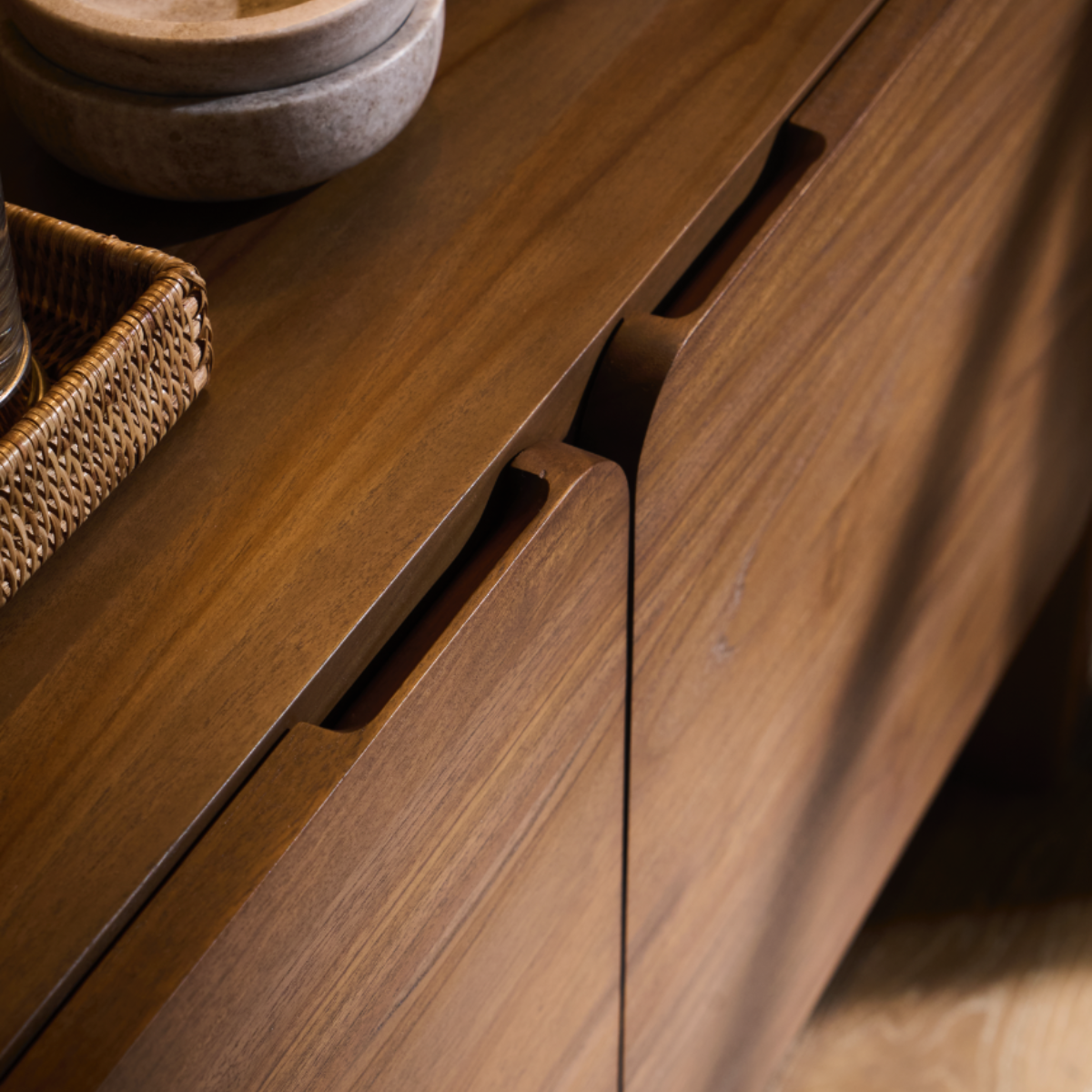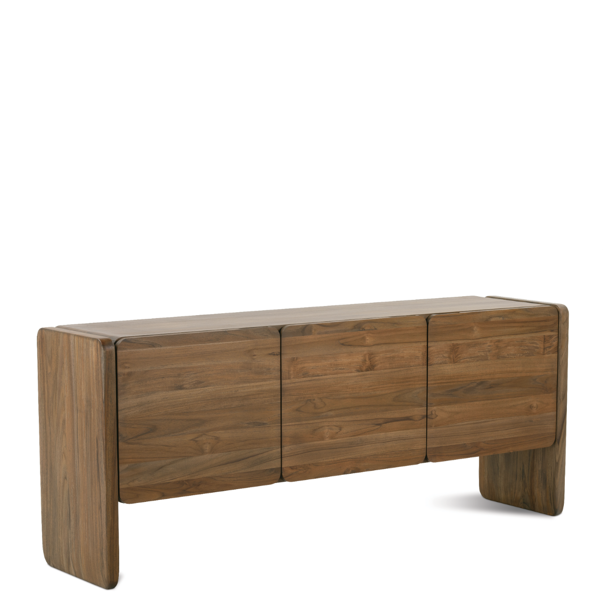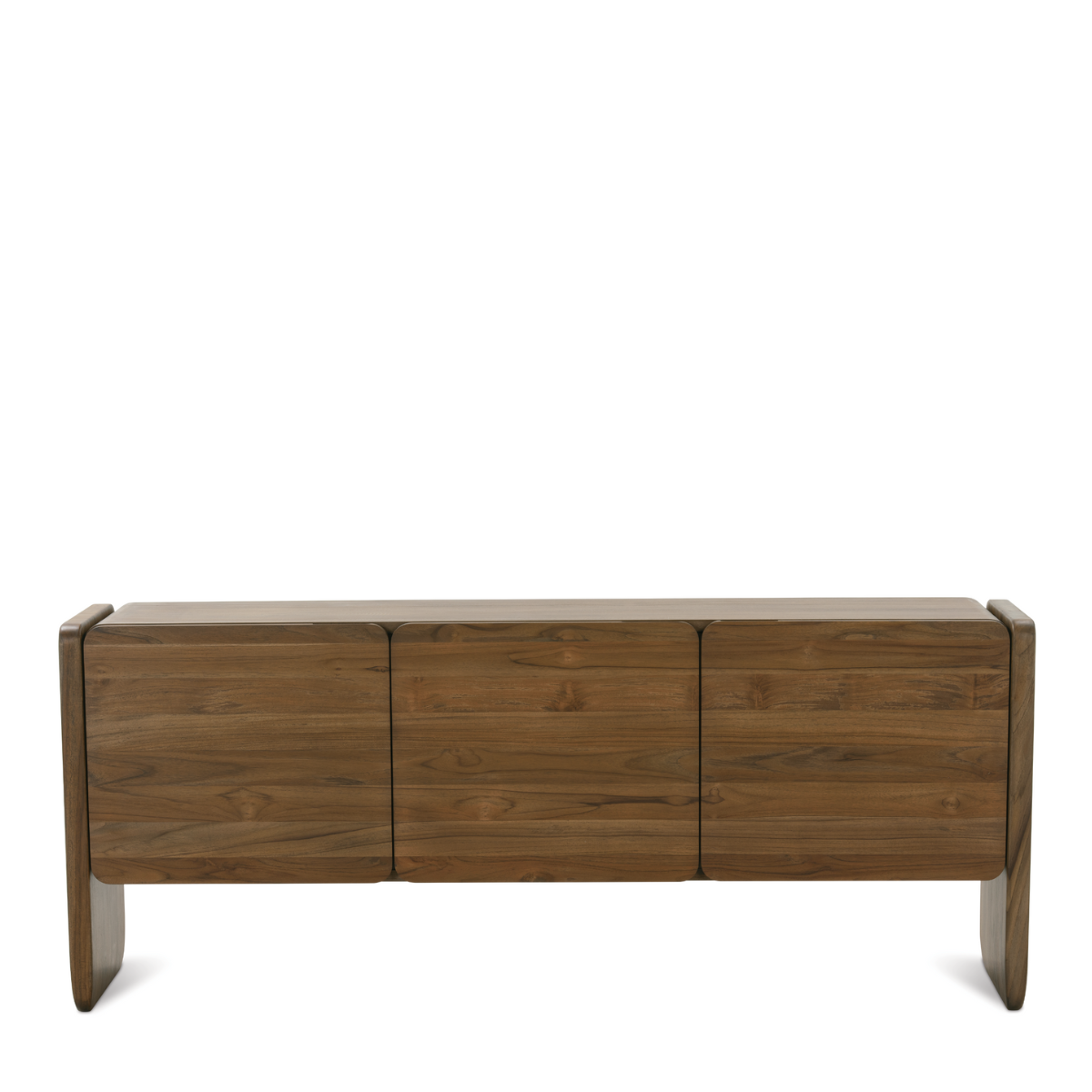Embodying the essence of modern minimalism with a warm, organic touch, the Nova Credenza stands as a testament to thoughtful design and masterful craftsmanship. This striking piece showcases the natural beauty of lightly stained solid teak through its clean lines and elegant proportions, while three seamlessly integrated doors offer generous storage without disrupting its sculptural silhouette. The rounded edges and substantial solid-wood construction create an inviting presence that softens contemporary spaces, making it equally at home in a dining room, living area, or sophisticated home office. Its versatile design serves as both a functional storage solution and an artistic statement, with the wood's natural grain patterns creating a subtle dance of texture across its surface that adds depth and visual interest to any interior setting.