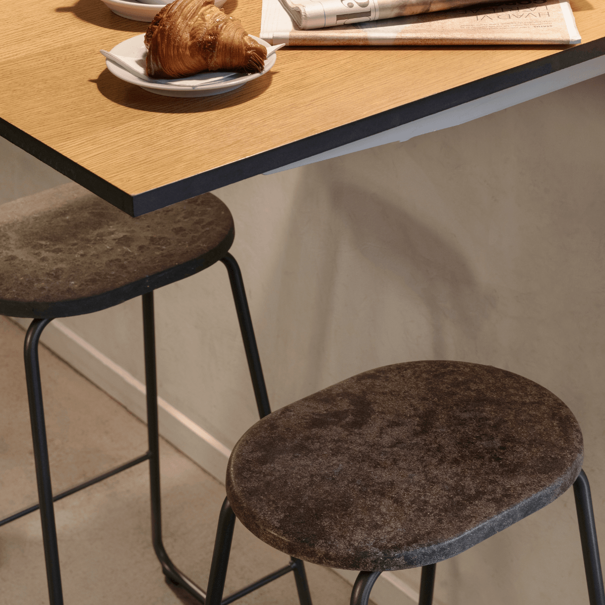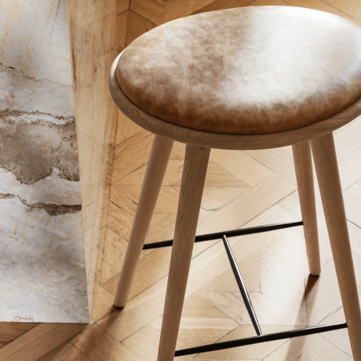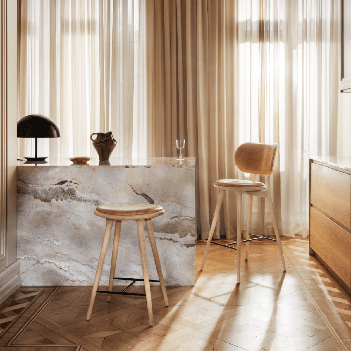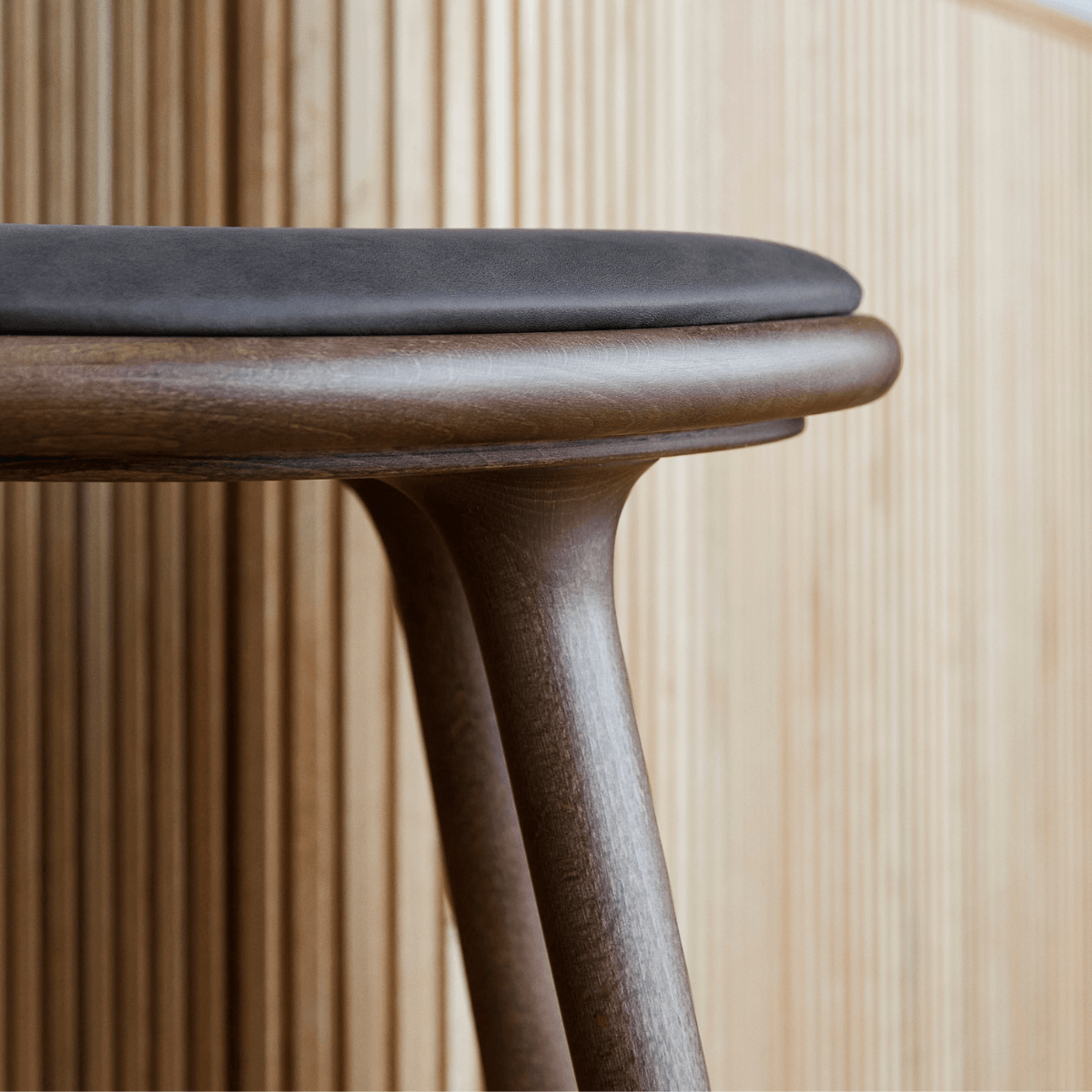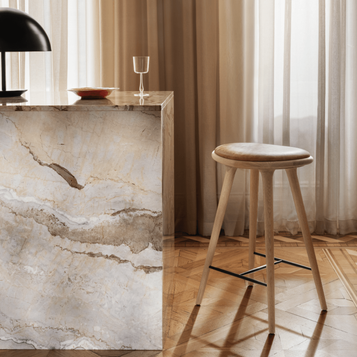 Space Copenhagen designed the High Stool with a new backrest — hence the name High Stool Backrest — which builds on High Stool’s beautifully fluid, sculptural and archetypal character, adding a generously rounded backrest for a heightened sense of comfort. The backrest itself is upholstered in soft durable leather and is fully supportive and comfortable so that it outweighs the need for armrests.