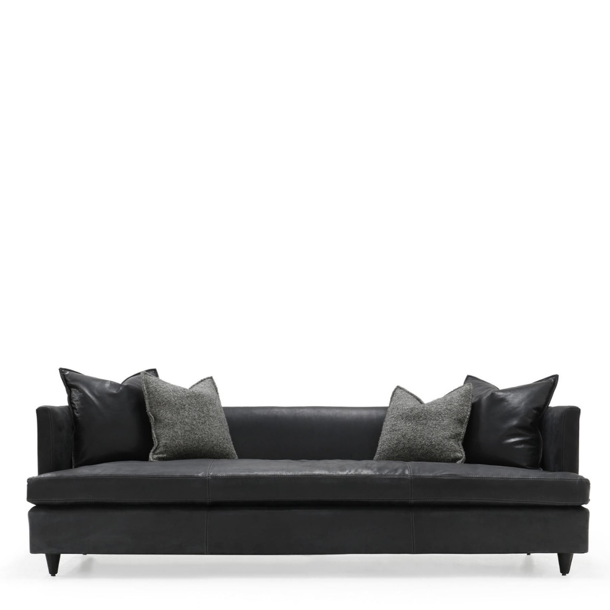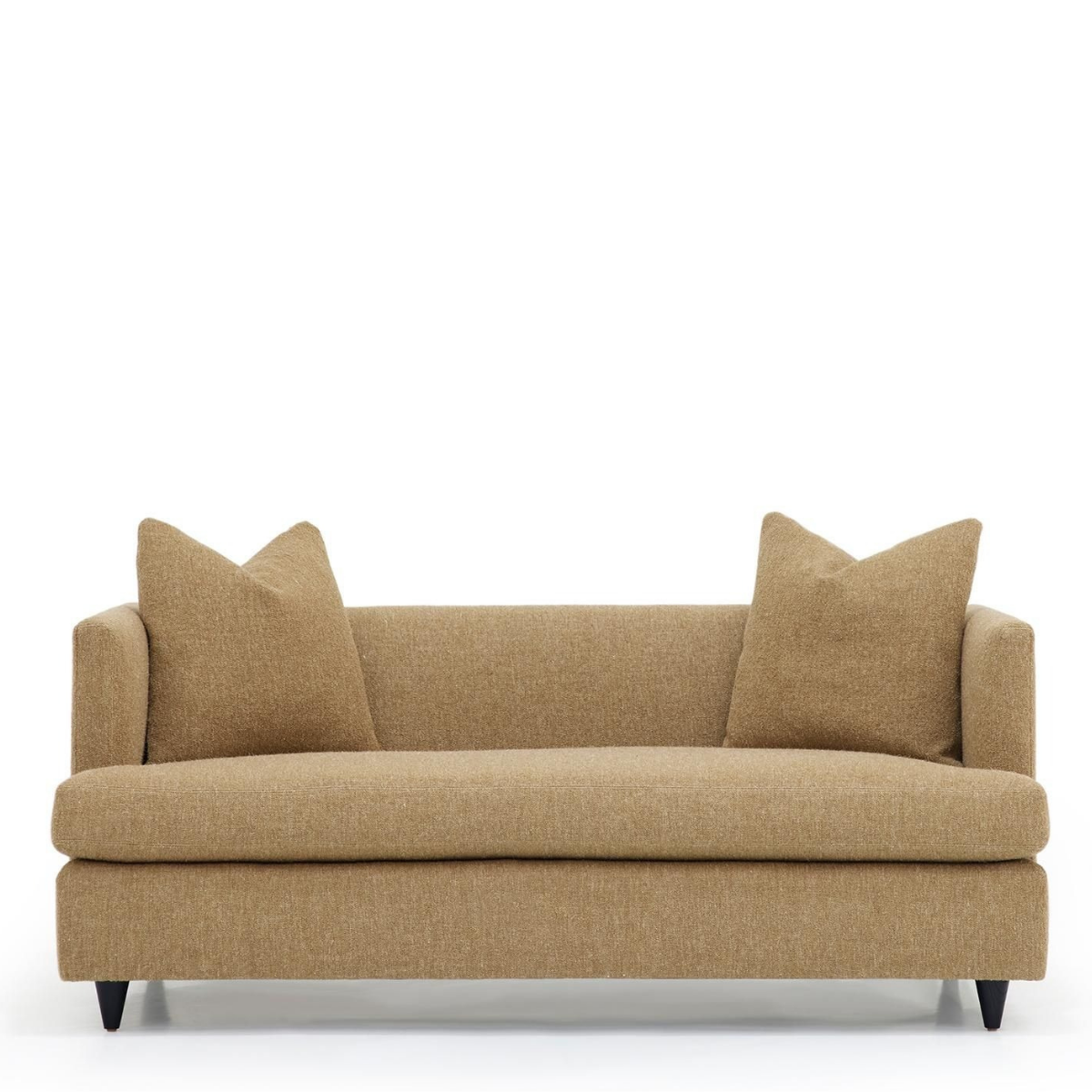 The Marilyn sofa collection features straight arms, a low tight back, loose T-shaped seat cushion, and exposed wooden conical legs.