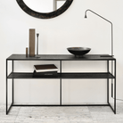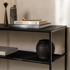 Relying on some of the oldest artistic ancestral techniques, the Pentagon's surface is shaped by our skilled artisans. Natural mineral powders and color pigments blend to form the unique finish. The receded lower shelf set against the thickness of the top makes for a revealing graphic contrast against the openness of the base. Clean lines and a standardized height showcase the simple beauty of the metal work.