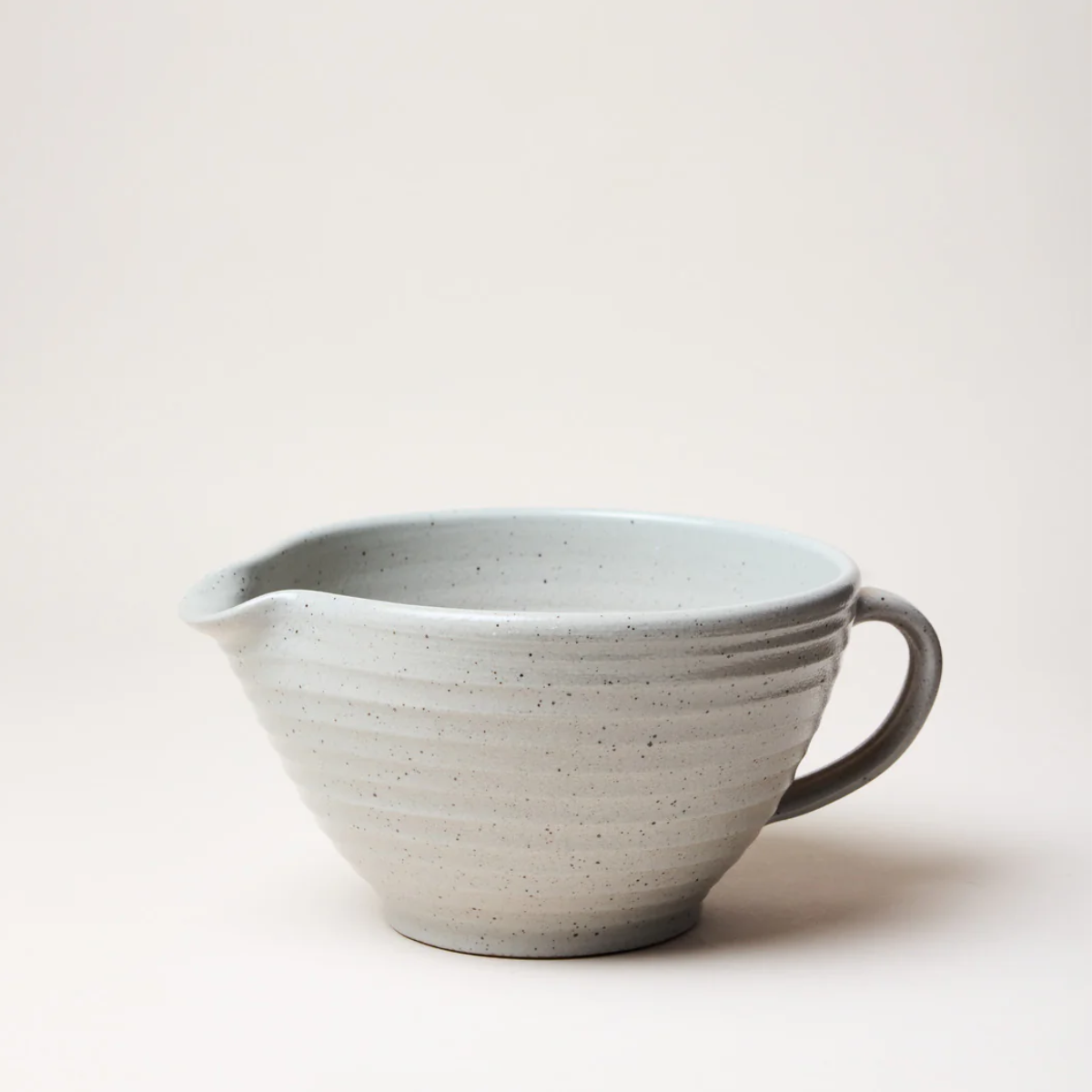 Handcrafted for your kitchen, this Agrarian Batter Bowl blends beauty and utility in one timeless piece. A sturdy handle and hand-formed spout make mixing and pouring smooth, whether you’re whipping up weekend pancakes or baking up a cake. It's stone grey glaze with natural speckling from the clay gives each bowl unique character that only hand-thrown pottery can offer. More than a mixing tool, it’s a piece you’ll reach for again and again.