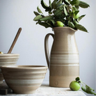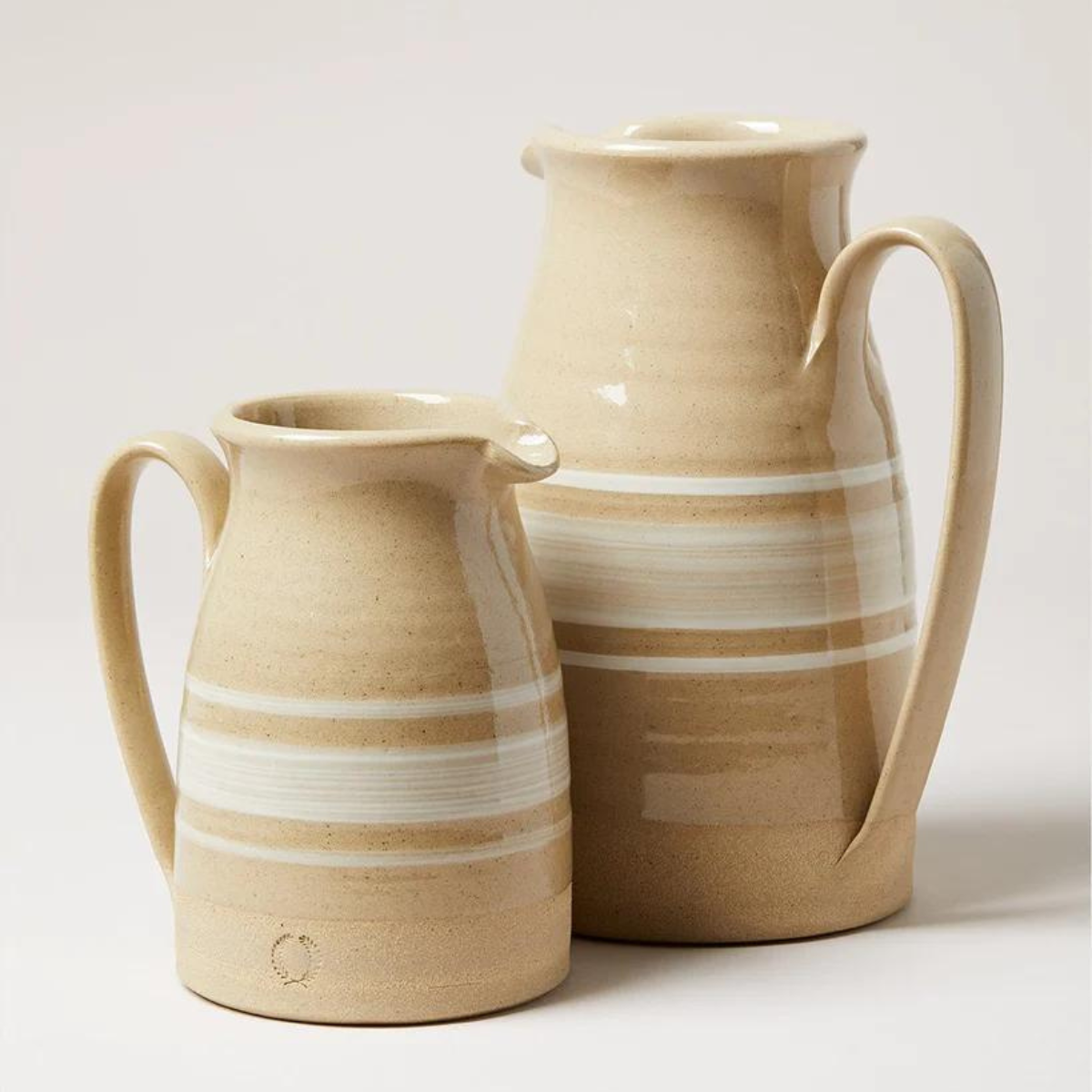 A modern take on an American Classic. Each decorative white band is hand-painted by Farmhouse's master potters. Decorate your table with a bouquet of flowers or pour your favorite beverages with an authentic touch.