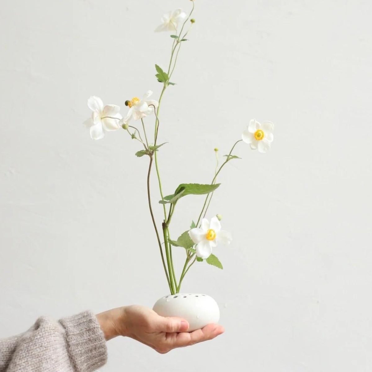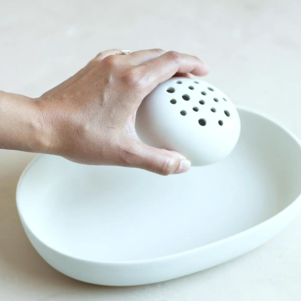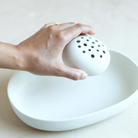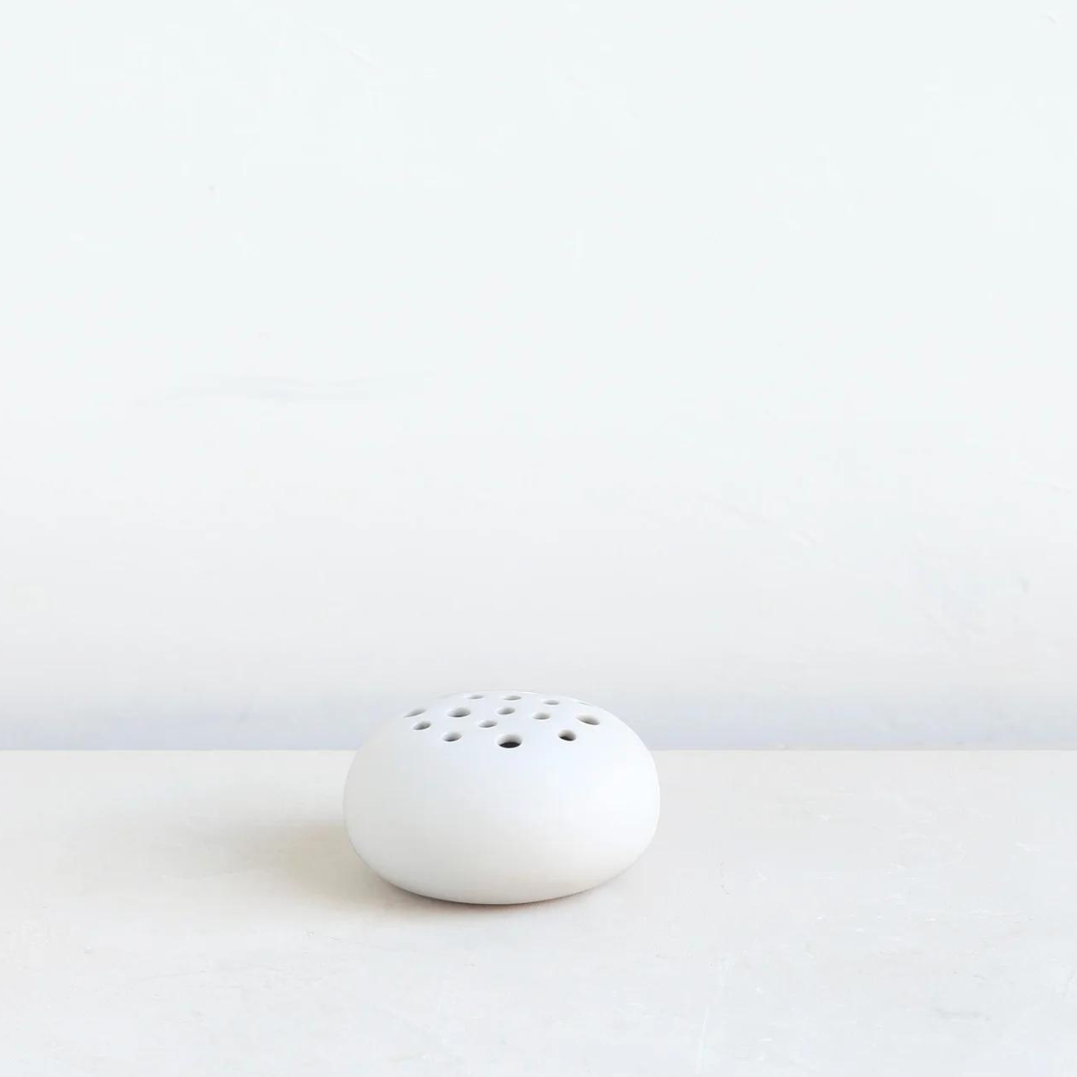 The Floral Society's stand-alone ceramic frog can be used independently or with any open vessel of your choosing. The holes can be filled with water to display a minimal selection of flowers, or keep herbs fresh on your kitchen counter. When not in use, display it as a sculptural object.