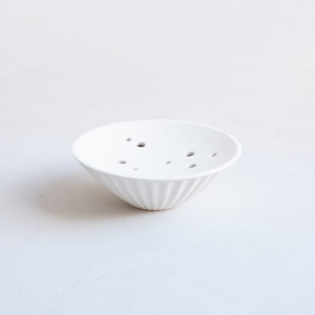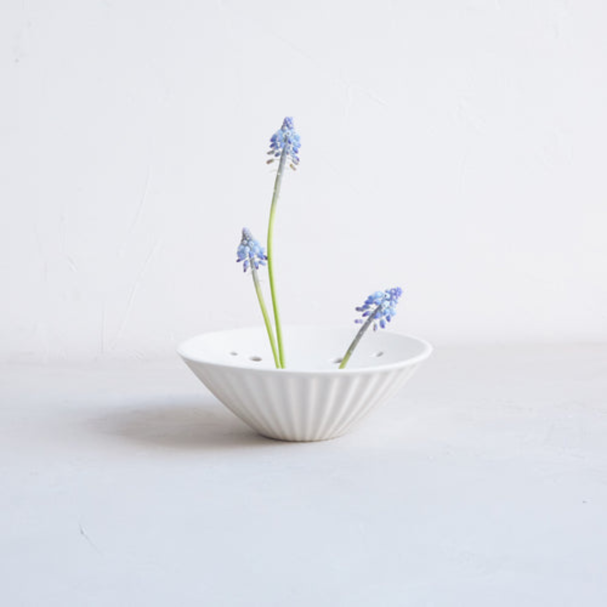 This stand-alone ceramic flower frog vase features a natural, matte-white finish and a soft pleated edge. The holes can be filled with water to display flowers and garden herbs.