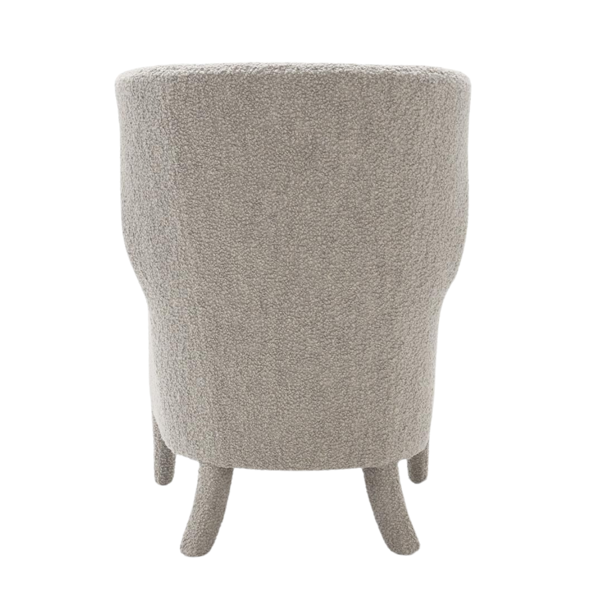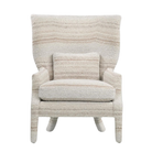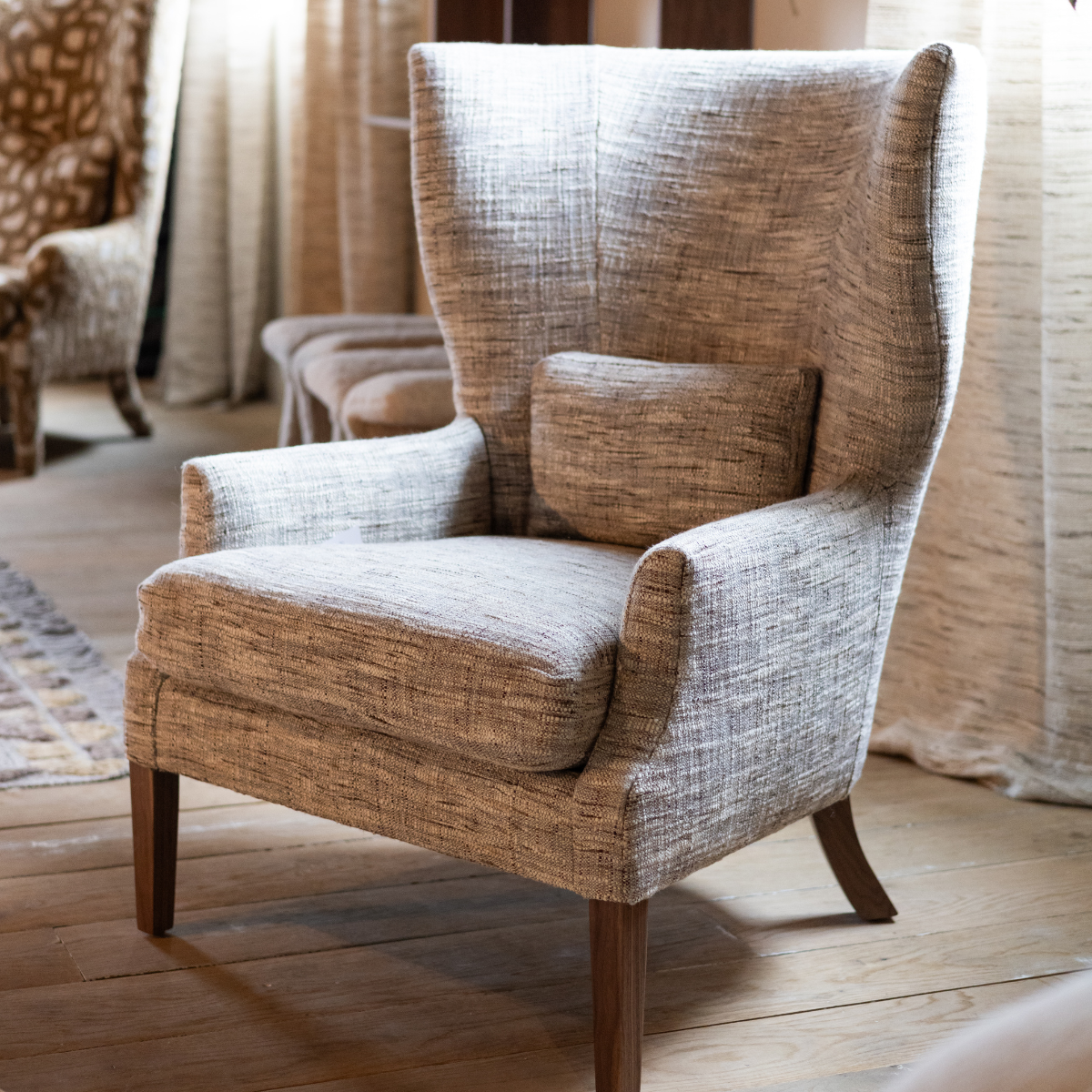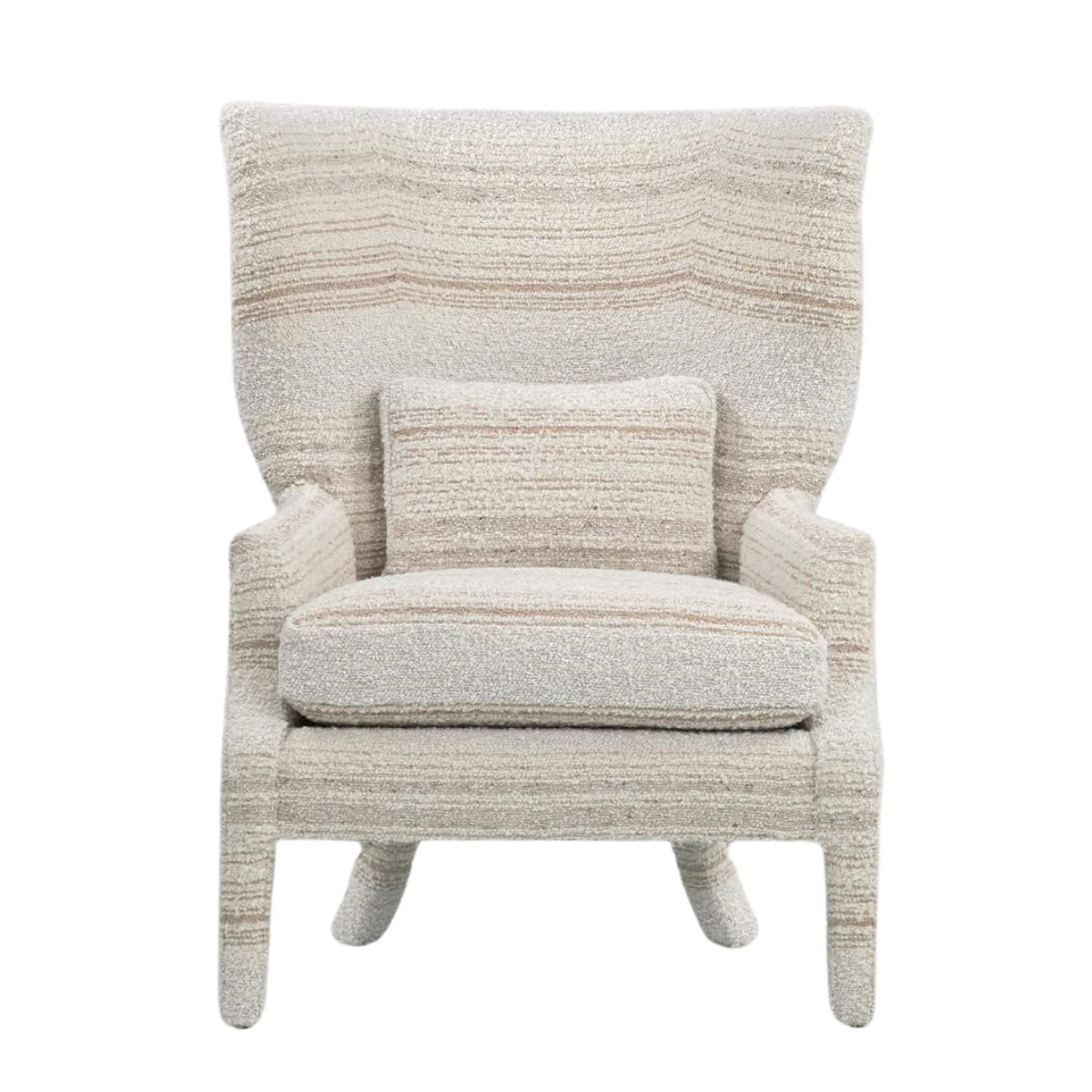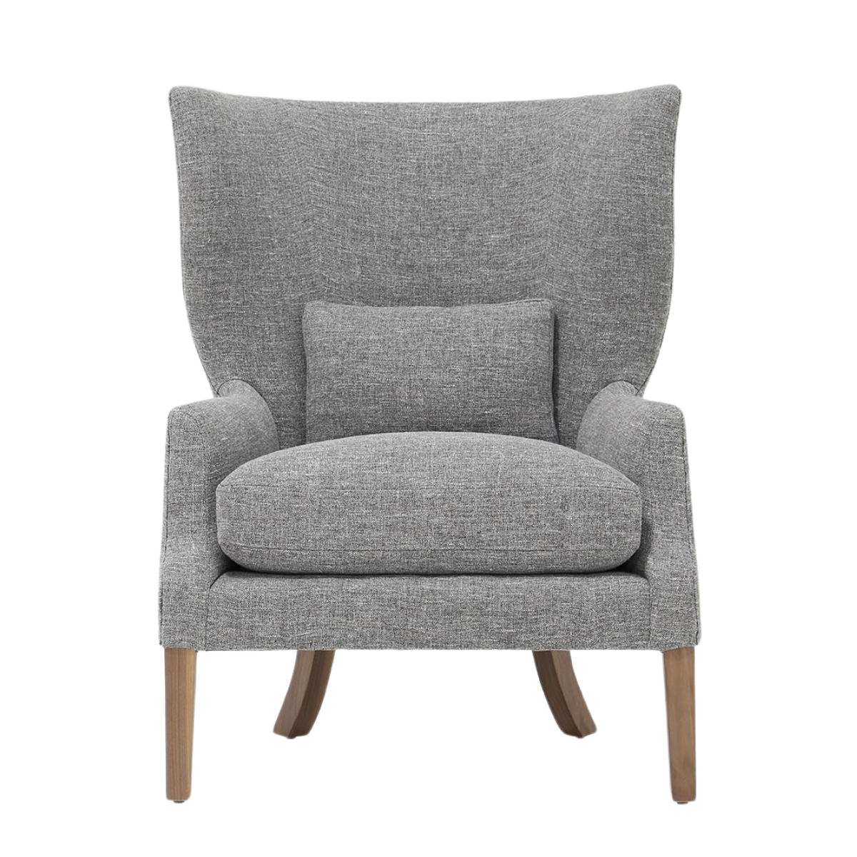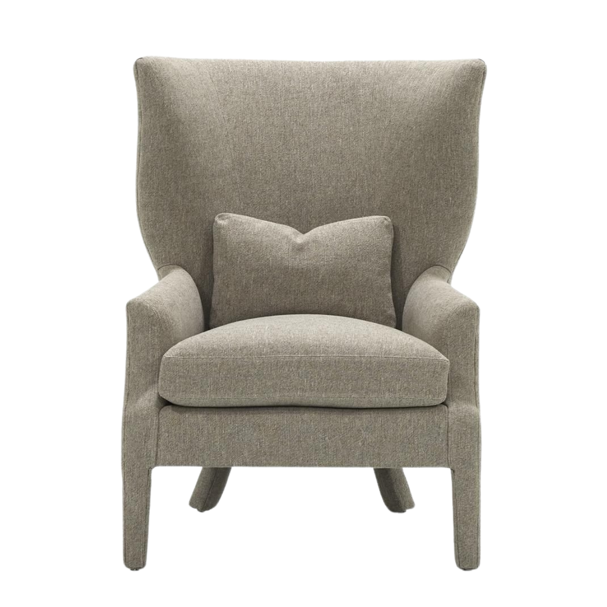 The Celine Wing Chair boasts an elegant high-back design with gracefully curved arms, a plush loose seat cushion, and a matching lumbar pillow, offering a sophisticated and comfortable seat.