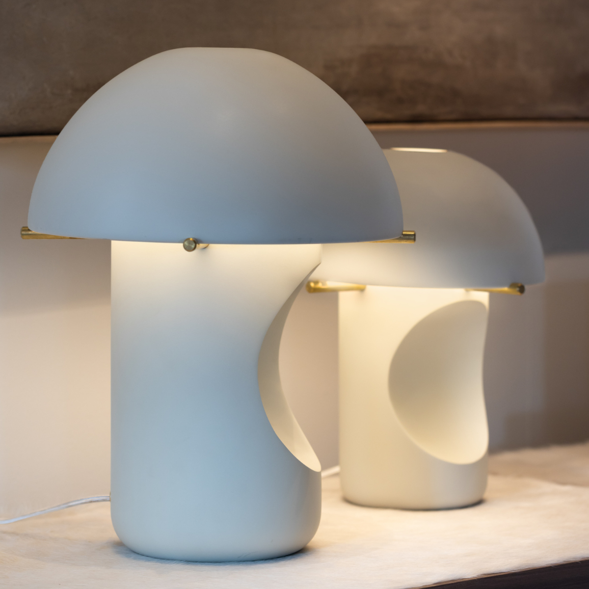 The Fun Guy collection is made from crushed stone composite. The round shapes are both positive and negative in form making light dispersion artful and unique.