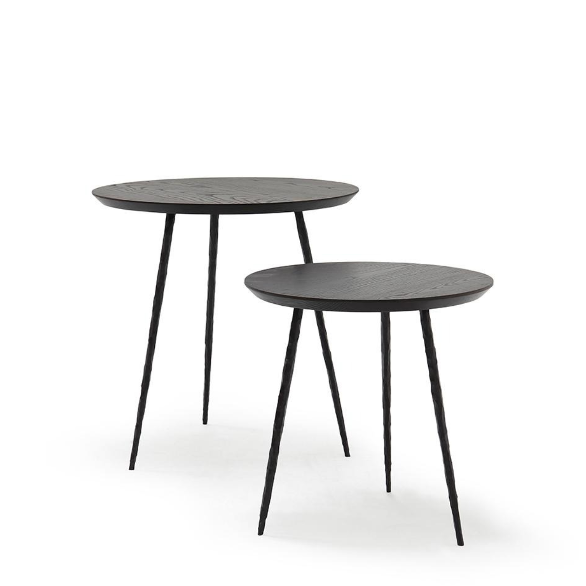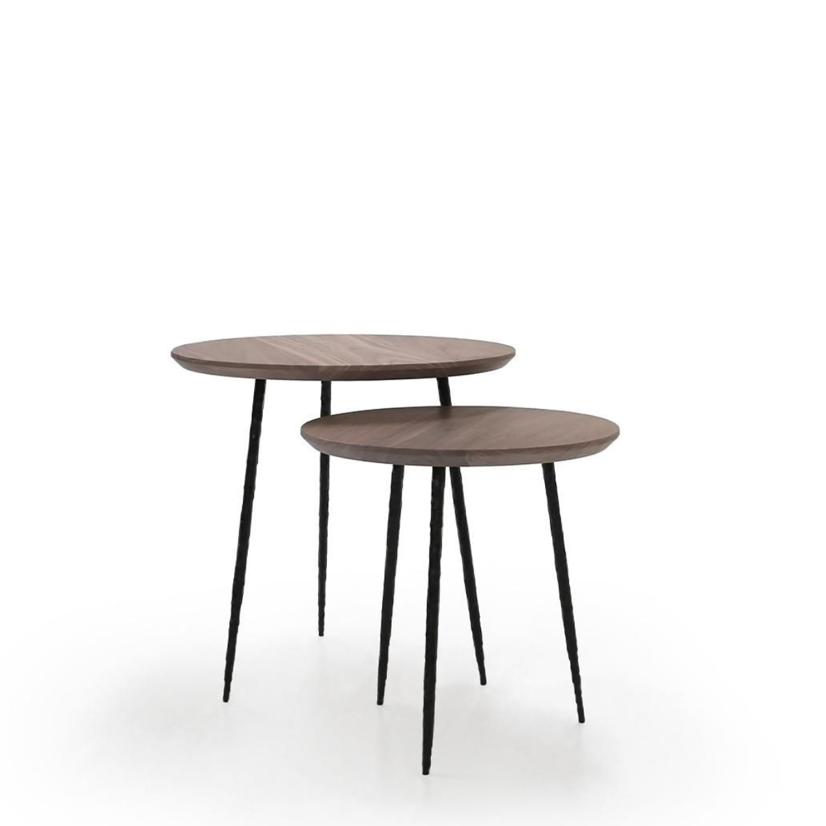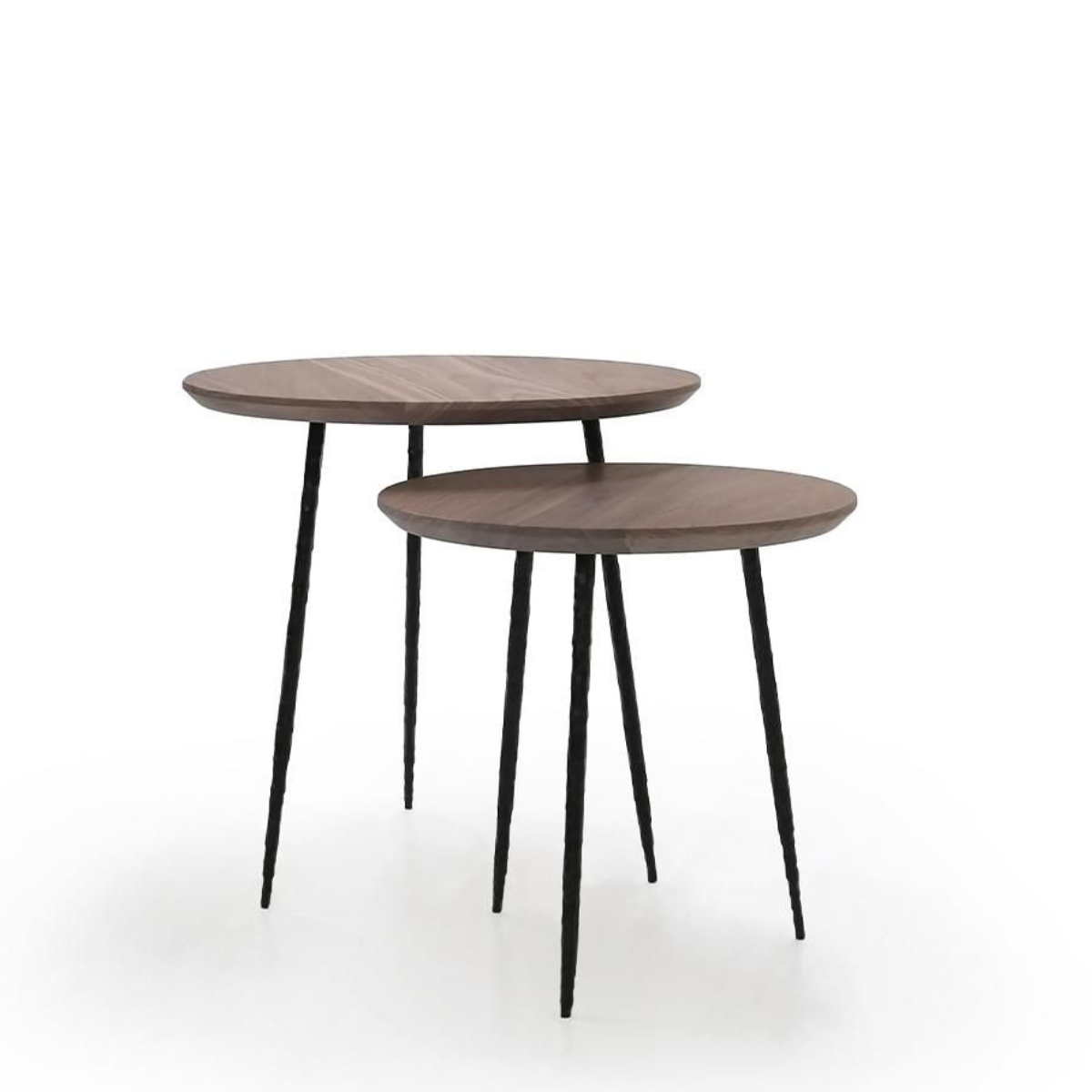 The Giaco Nesting Tables feature sustainably harvested hardwood tops and hand hammered steel legs inspired by the works of renowned sculptor and painter, Alberto Giacometti.