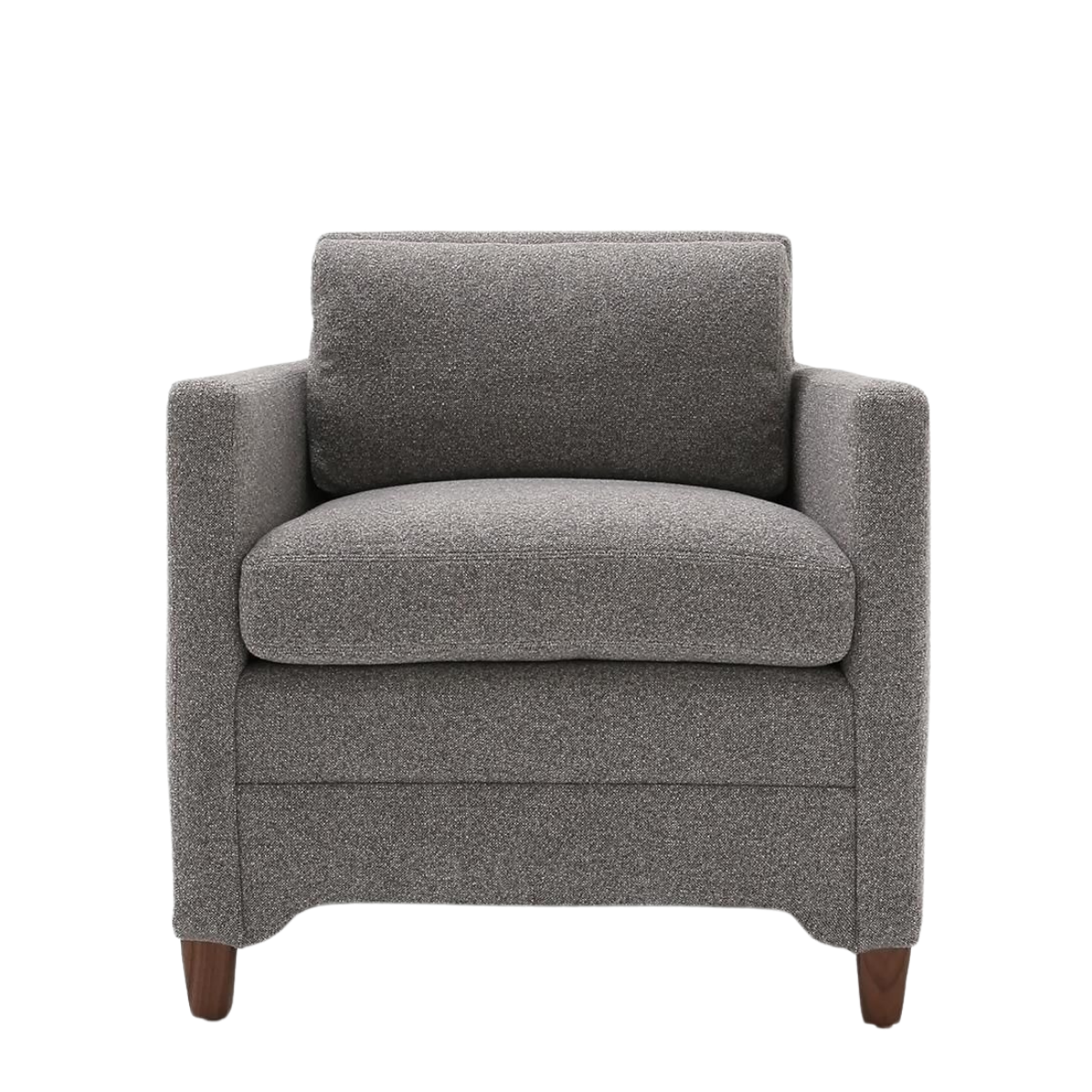 The Jean Chair boasts a sleek and modern silhouette, featuring clean, straight arms, a low, tight back, a generously padded loose seat cushion for exceptional comfort, and elegantly tapered wooden legs.