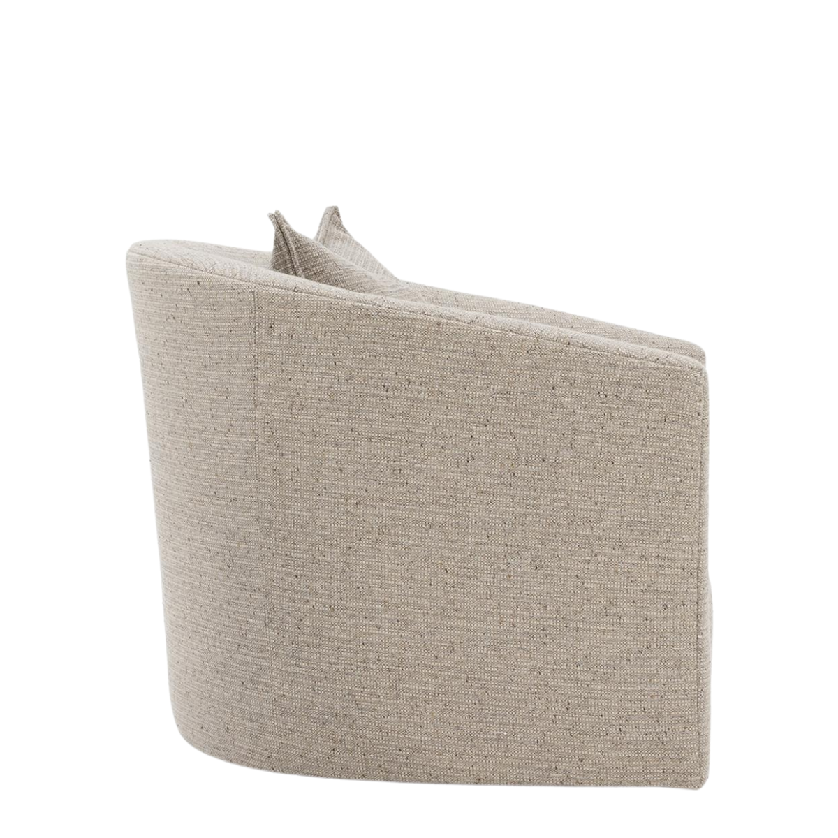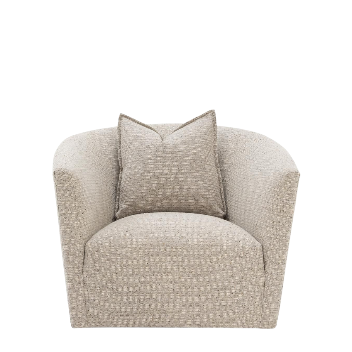 The Klara Swivel Club Chair features a sleek, curved backrest, tight seat cushion with plush toss pillow, and a whimsical swivel base.