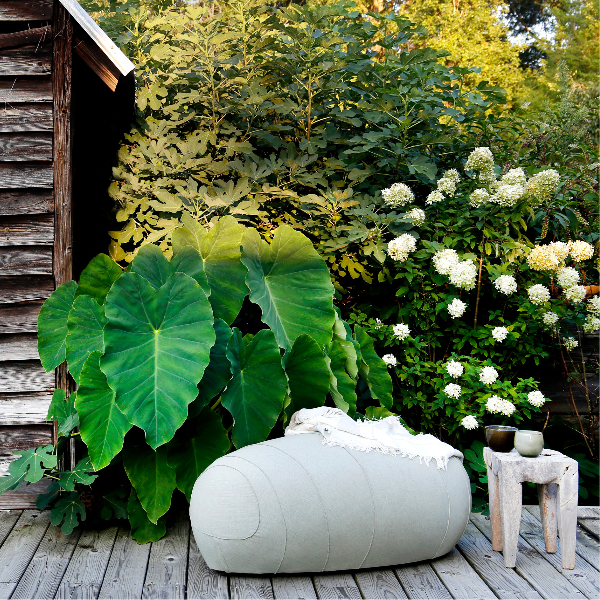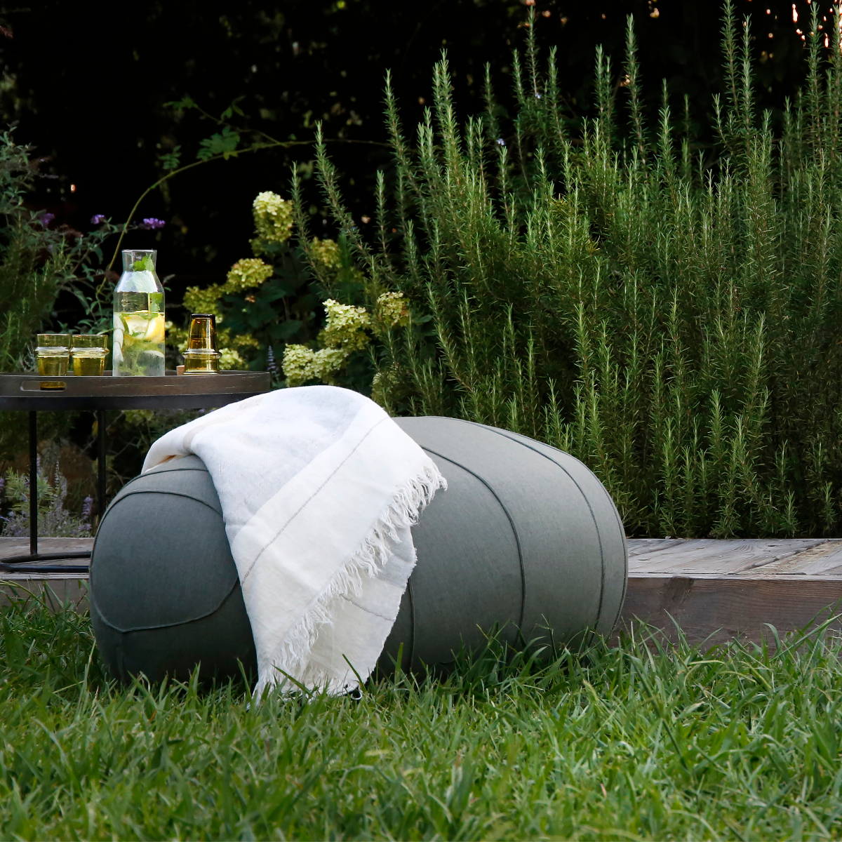 The Lola Outdoor Dining Pouf delights with its charmingly rounded form, seamless silhouette, and inviting cushion.