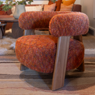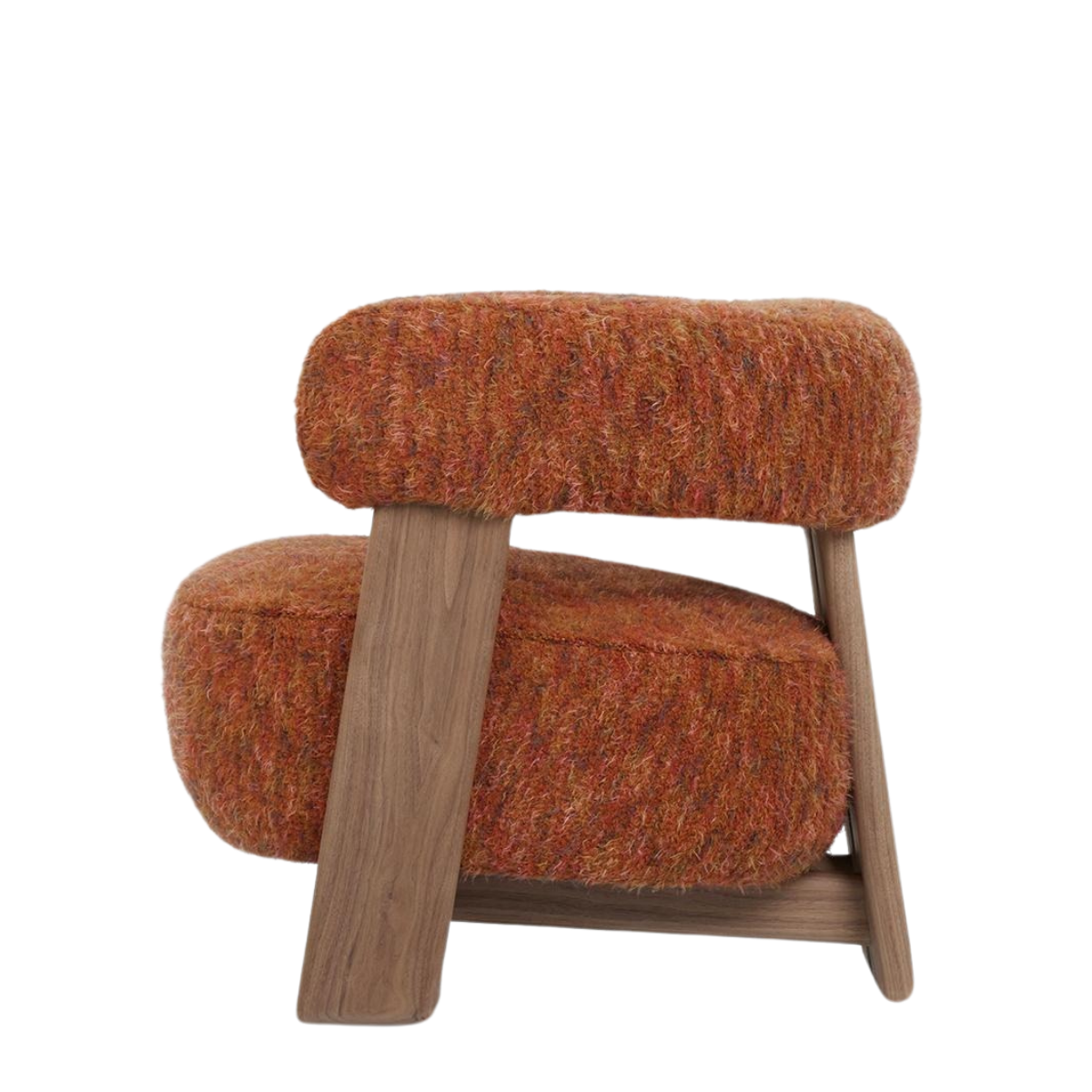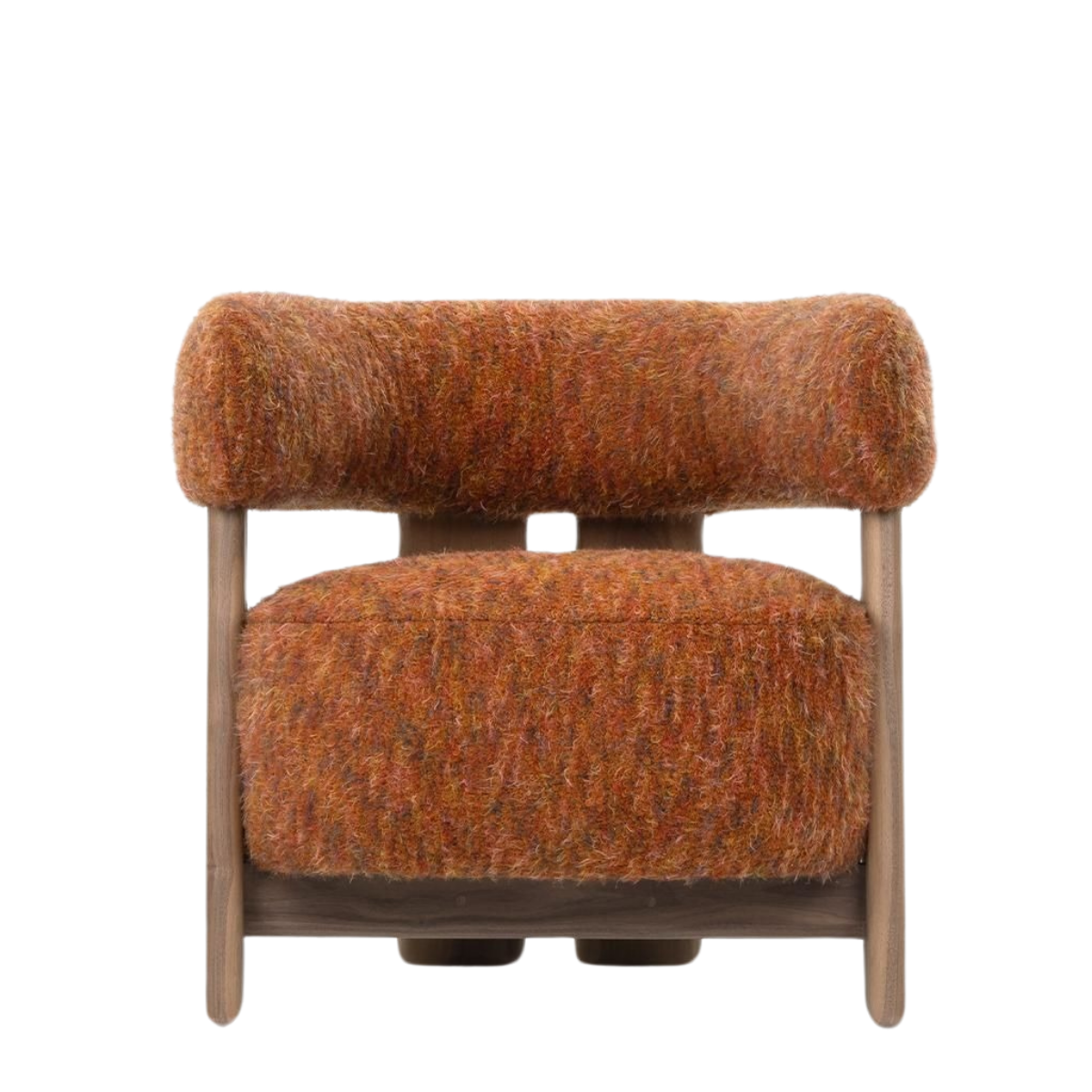 The Otis Chair combines bold, angled wood legs with a sculptural, elevated design, offering both sturdy support and striking visual appeal. Its tight, rounded cushions contrast beautifully with the geometric base, making it a guaranteed standout piece.