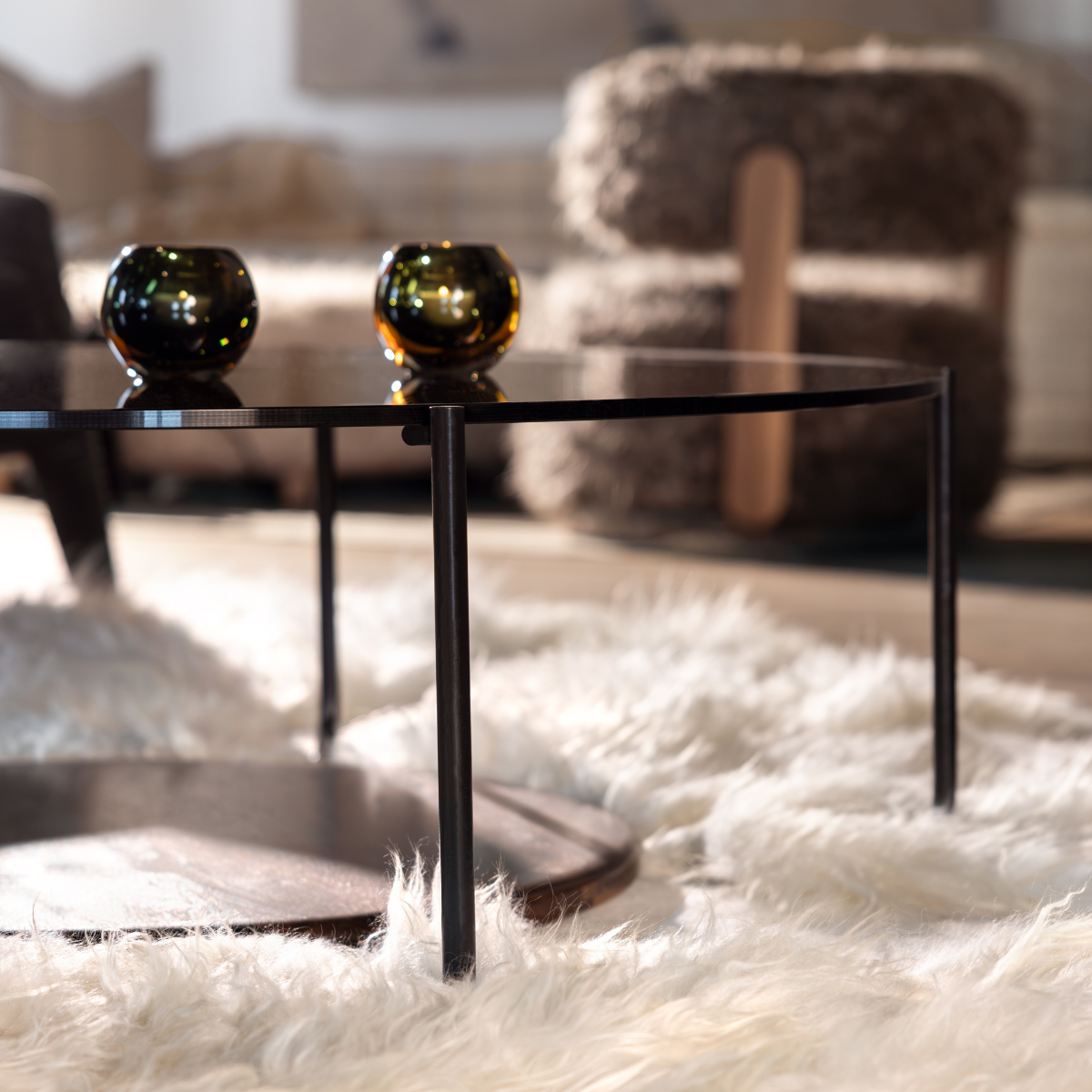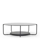 The Sonar Coffee Table features a delicate, fumed glass top and a solid hard wood shelf detail supported by a minimalist black metal frame. Mixed material elements add modern sophistication to any living space!