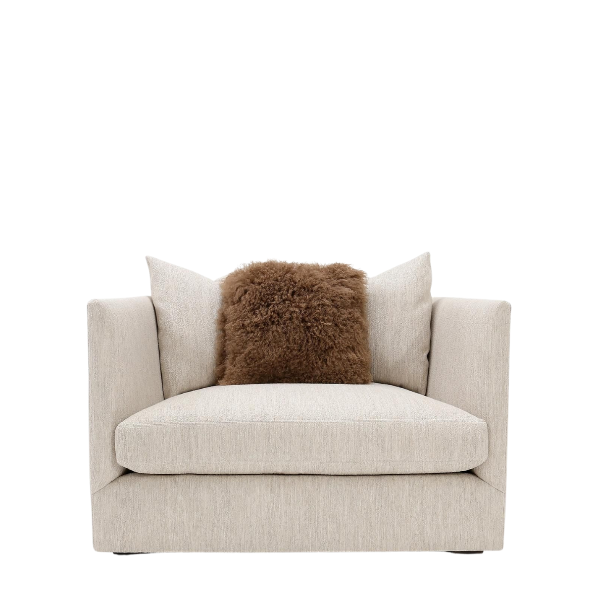 The Tatum Chair features a distinctive silhouette with angled out arms, a sloped back, and loose seat and back cushions.