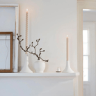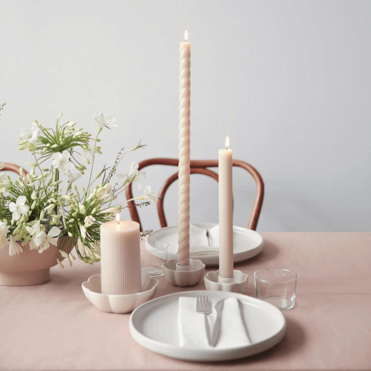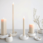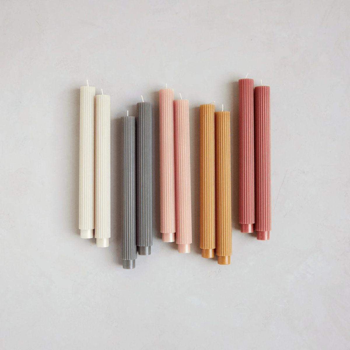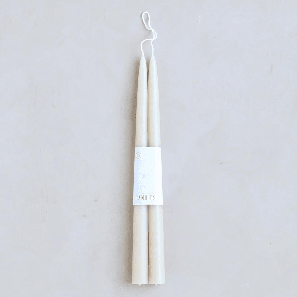 The Floral Society's Fancy Taper Candles are hand-molded and embody a superior depth of color. A cotton wick is used for the cleanest burn, and the base is sized to fit a standard holder. Each 18” candle is crafted to burn for eighteen hours. Subtle variations in wax depth and color opacity may occur.