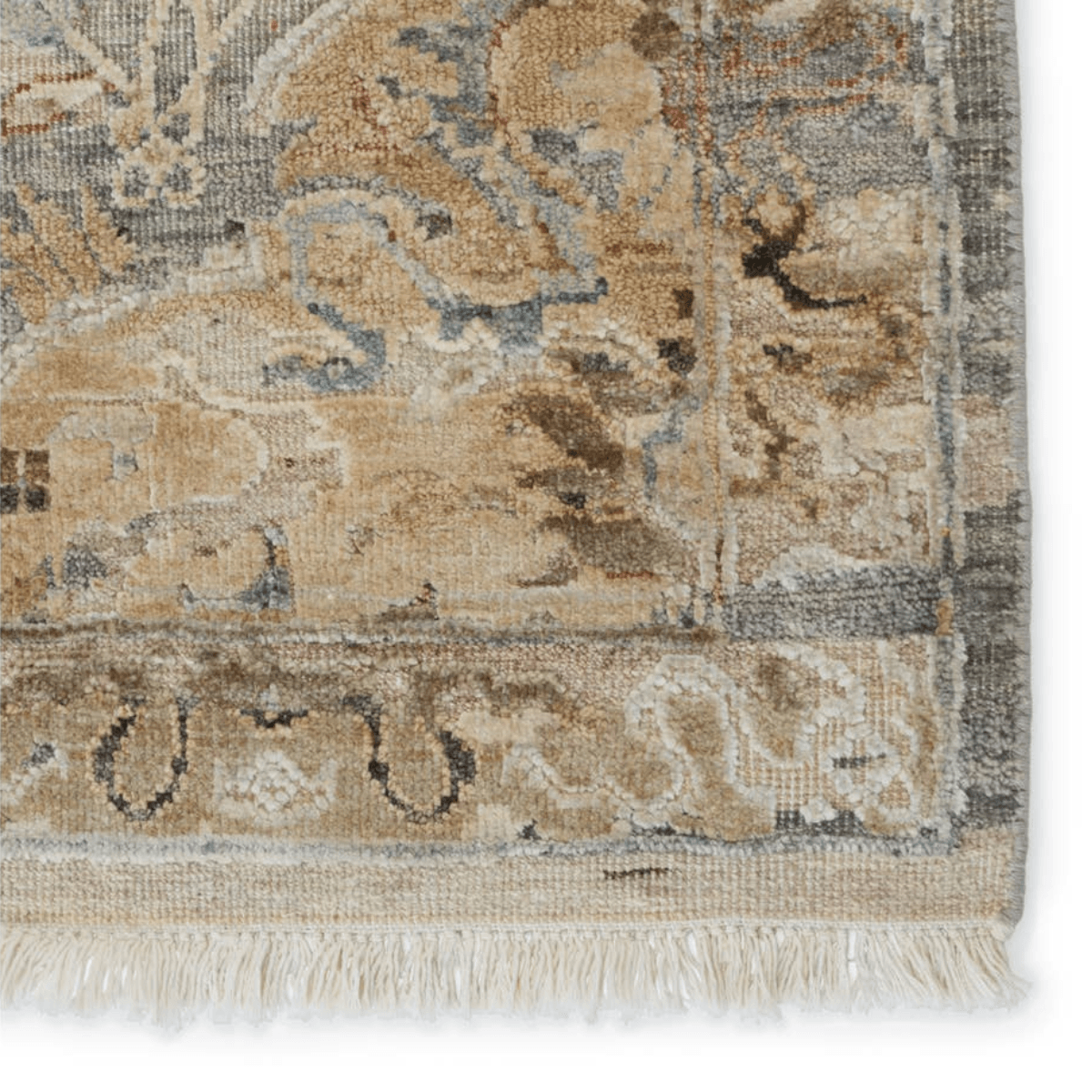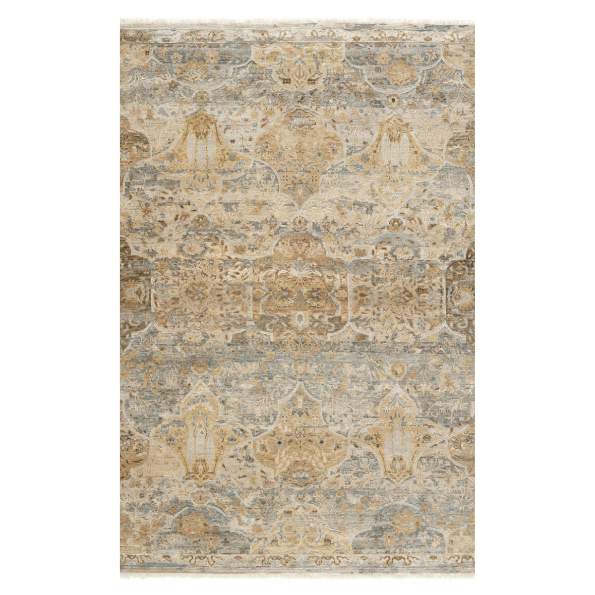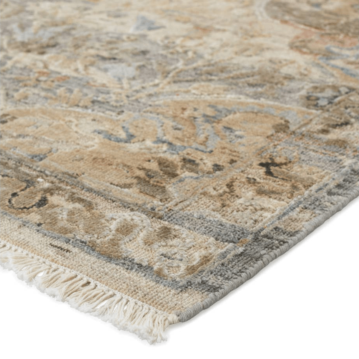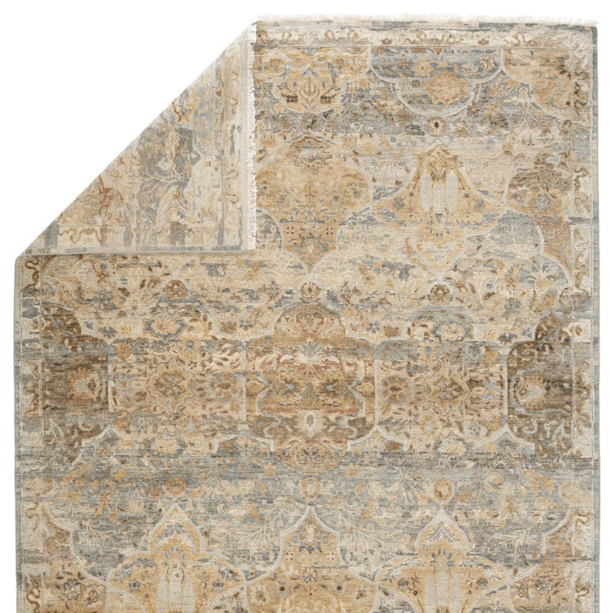 Elegantly crafted of wool and silk, the Amoret collection combines the timeless hand-knot technique and oxidation process for a modernized look. Inspired by Persian patterns, the rug features a floral trellis design with serene hues of beige, gray, blue, green, and taupe. An oxidation process creates a texturally diverse yet plush high-low pile. This area rug perfects any low-traffic area like formal living spaces and bedrooms