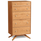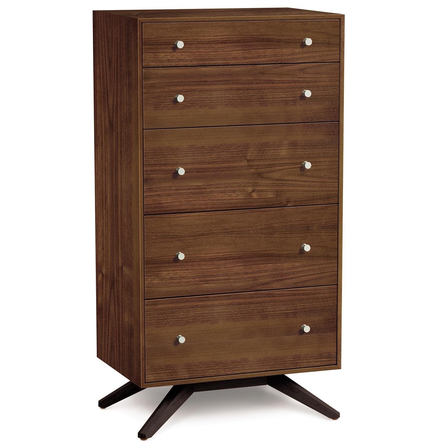 With deeply splayed legs producing dramatic cantilevers, the Astrid Dresser is an engineering feat that defies expectations and inspires a sense of possibility. Astrid dressers and chests feature solid wood throughout and soft-close, self-close full extension drawers. Includes a Drawer Interlock System which allows only one drawer per vertical column of drawers to be open at a time as a safety feature.