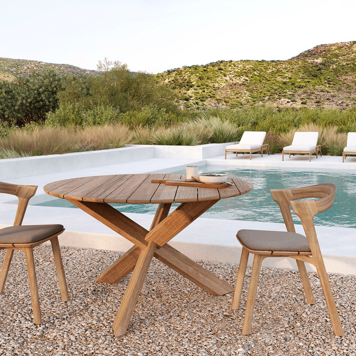 Ethnicraft's Circle dining table is all about inspiring your loved ones to spend a little more time at the table. Its solid legs intertwine in perfect balance, while the adapted grooved design makes outdoor life a simple pleasure.
