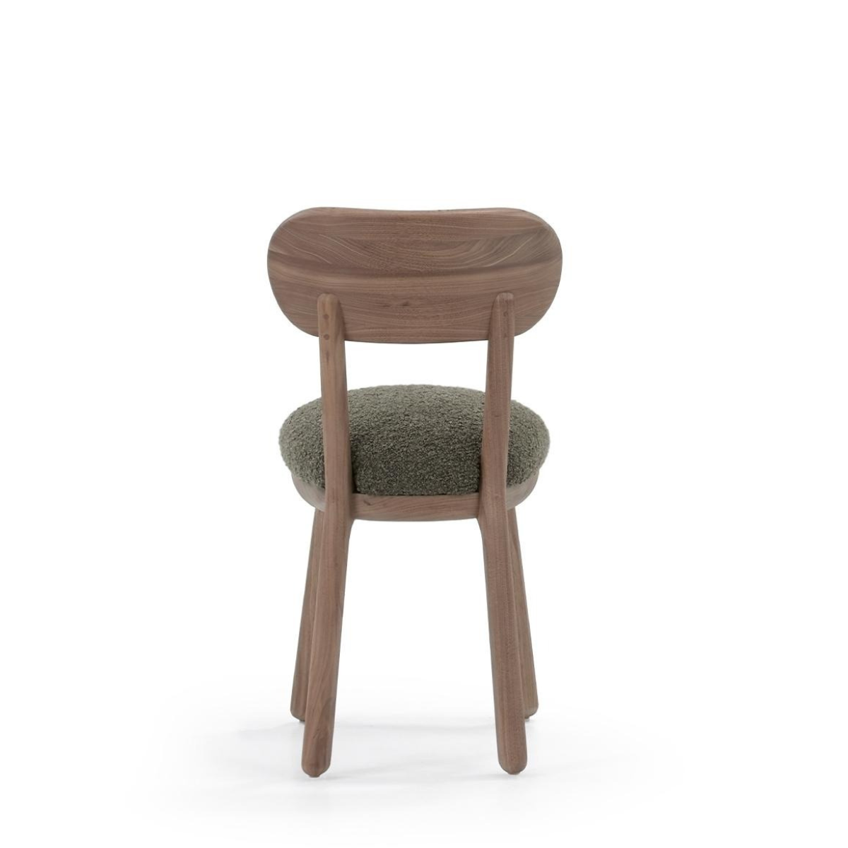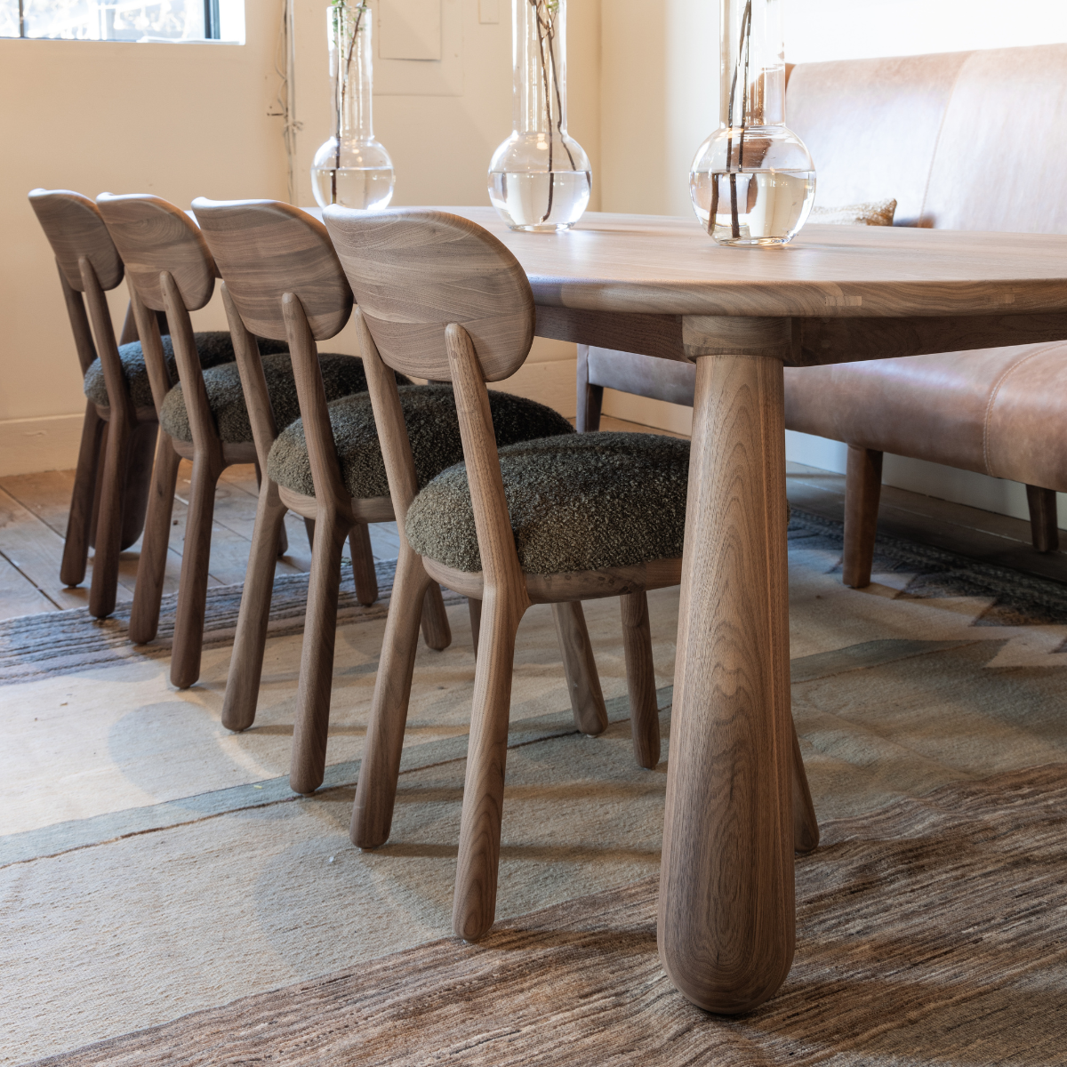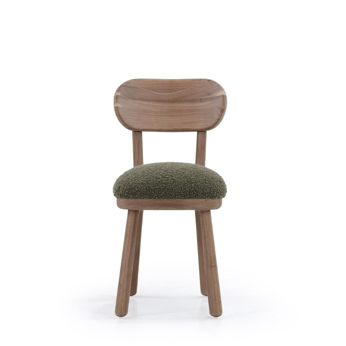 The Coco Dining Chair enchants with its playfully rounded wooden backrest, gently tapered legs, and a plush, inviting seat cushion, creating a harmonious blend of comfort and whimsy.