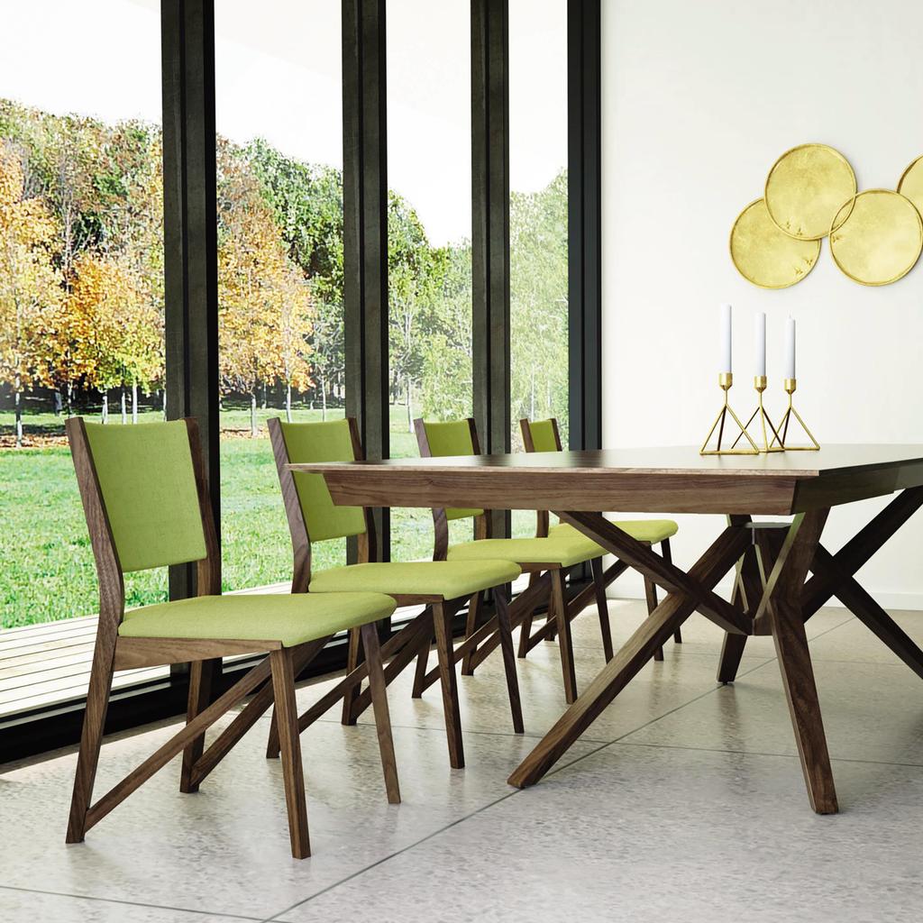 Exeter dining is a striking marriage of isometric tension and modern design. Crafted in solid wood the Exeter Chair is available in a range of microsuede, fabric, Ultrasuede®, Ultraleather® or leather colors.