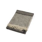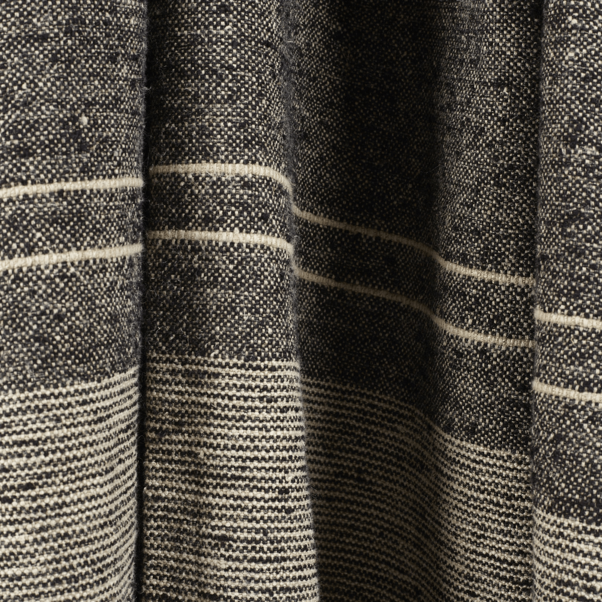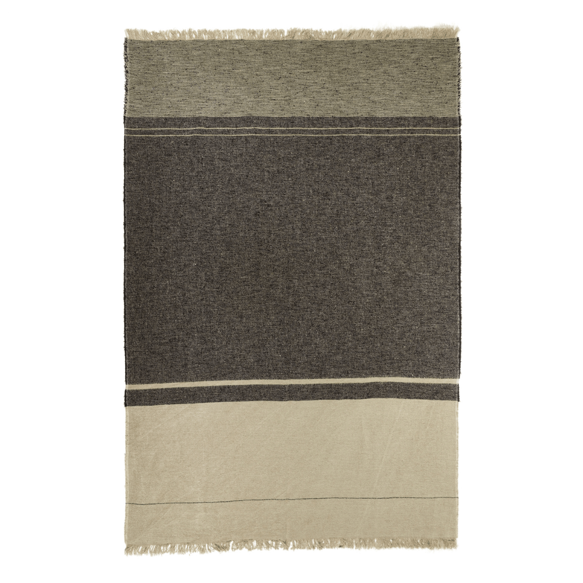 The central section of this throw is a black/flax plain weave construction, while the top end is a black/flax small stripe and the bottom end is solid flax with a single black stripe. Both ends are finished with a flax fringe.