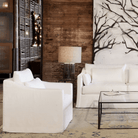 - Product Example: Rebecca Slipcovered Swivel Chair, Upholstered in Denim White