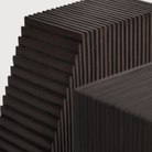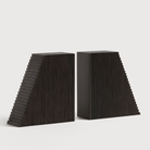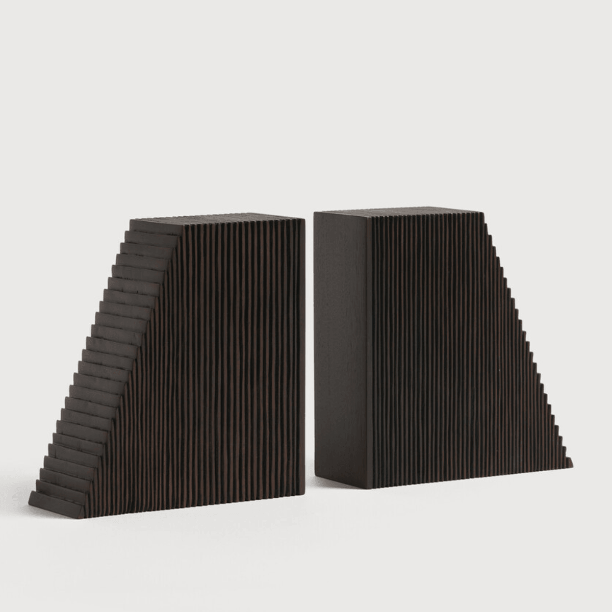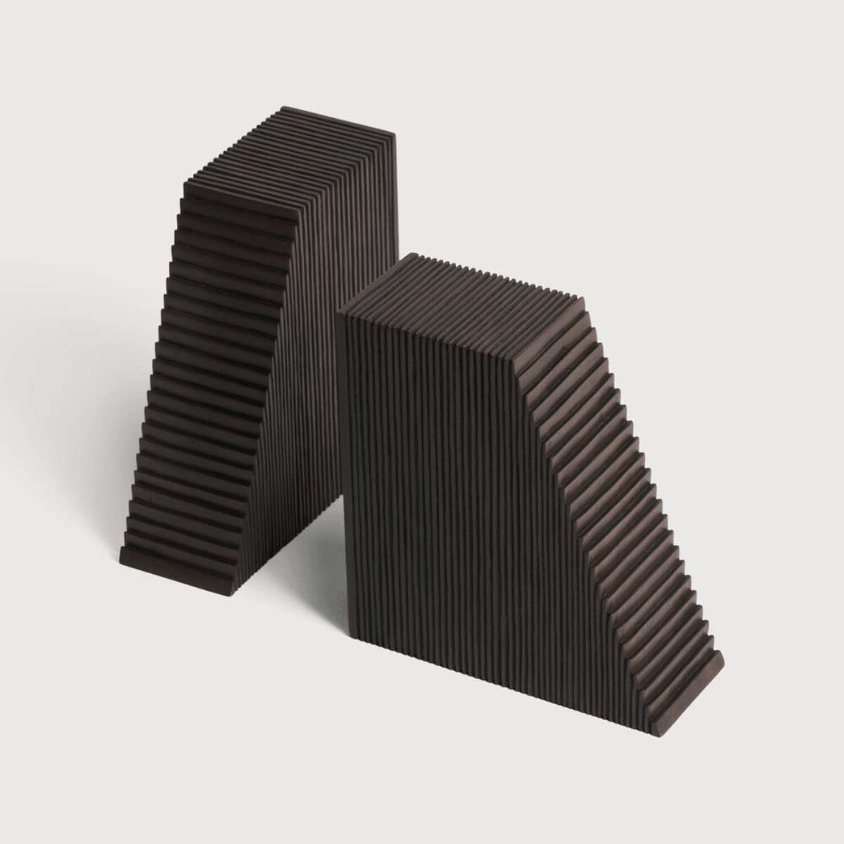 The Grooves book ends are soulful to say the least. Every single line you see is hand carved, making each piece truly unique. Small imperfections are part of the story, even more so: they enhance Grooves' character. The result is a slightly different surface every time, each with its own rhythm and dynamics. Made from solid mahogany finished with a dark brown varnish, these book ends complement the wider Grooves collection.