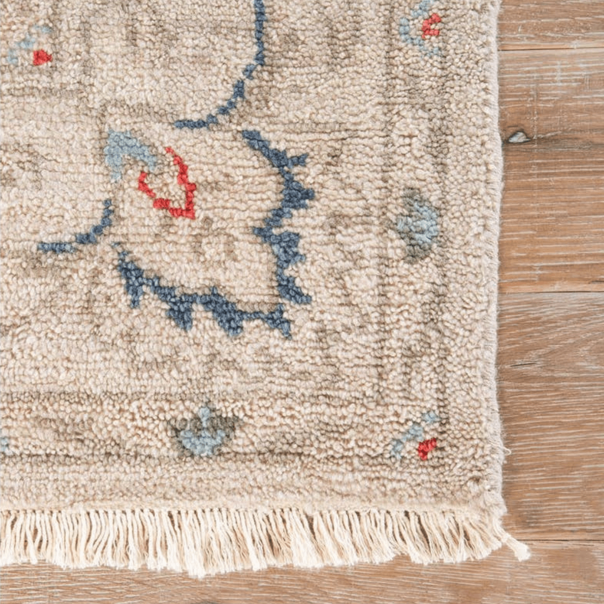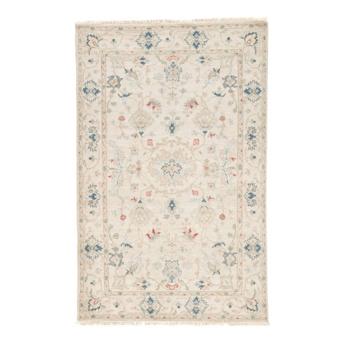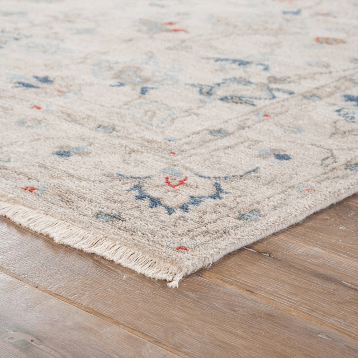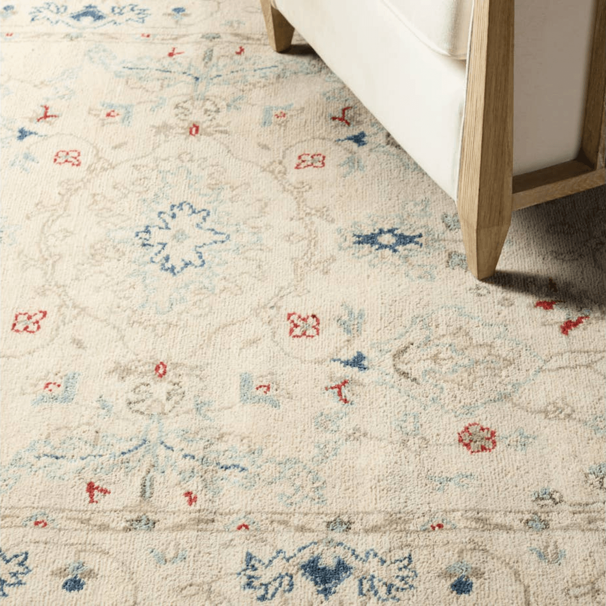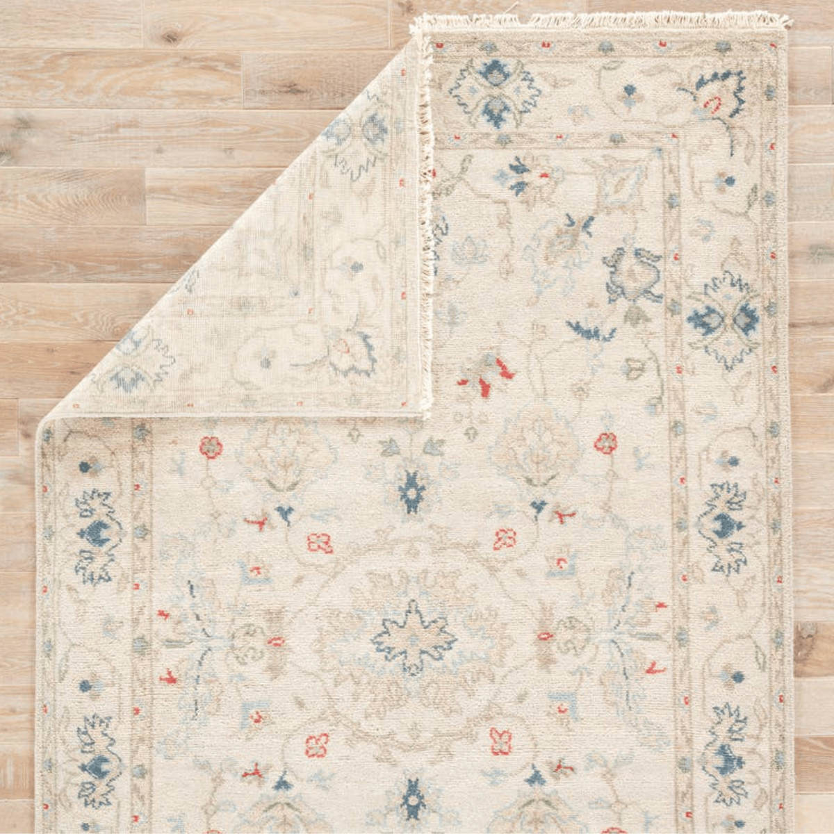 This luxurious hand-knotted wool rug combines a whimsical colorway with a stunning traditional floral pattern for a fresh, updated look in living rooms and dining spaces. Brilliant blue and orange details decorate the scrolling vines and blooms of this ivory accent.