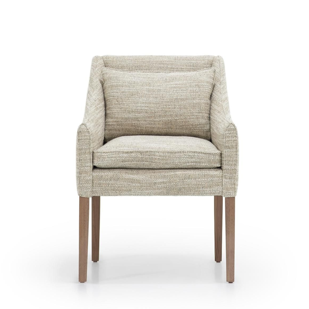 The Jill Dining Chair enchants with its elegantly tapered legs, gently sloped armrests, and a luxurious loose seat and back cushion, combining refined style and unparalleled comfort.