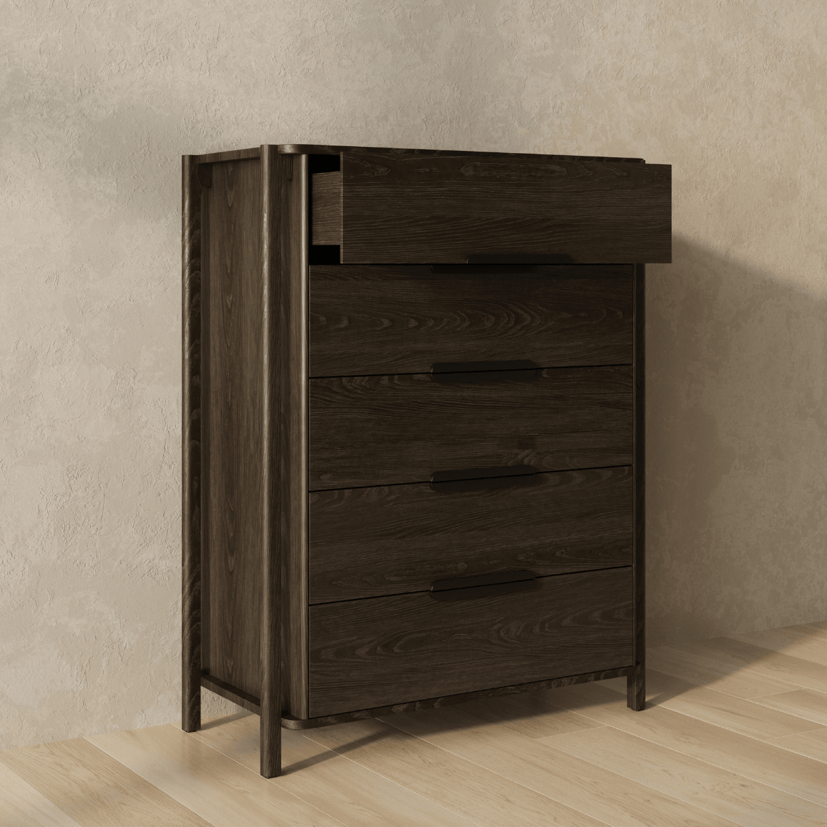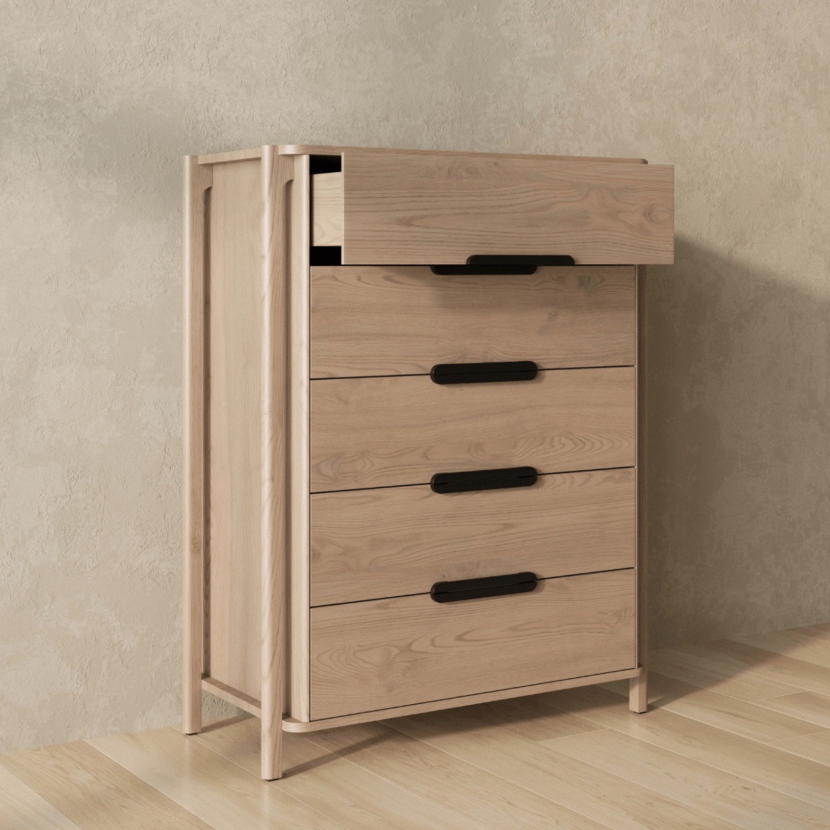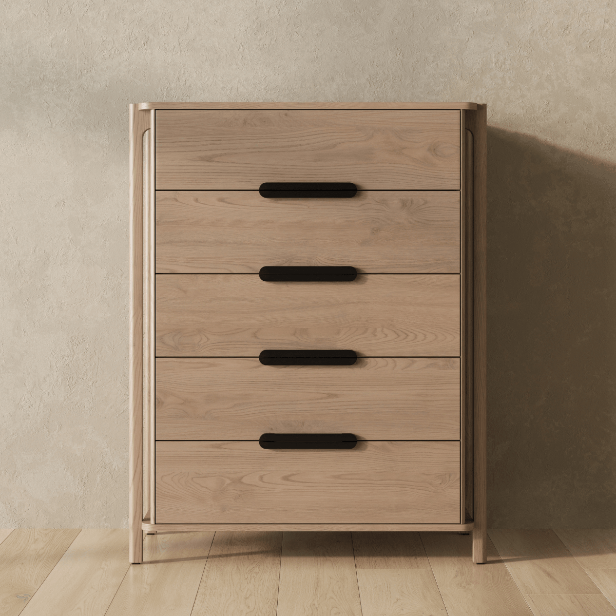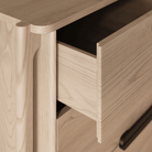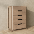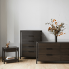 The Join dresser defies traditional construction and redefines what it means to be intentionally made. Outset legs stretch upwards to simultaneously support and form the top surface and cabinet. Five spacious drawers outfitted with blackened-wood pulls offer spacious bedroom storage and play homage to functional connection.
