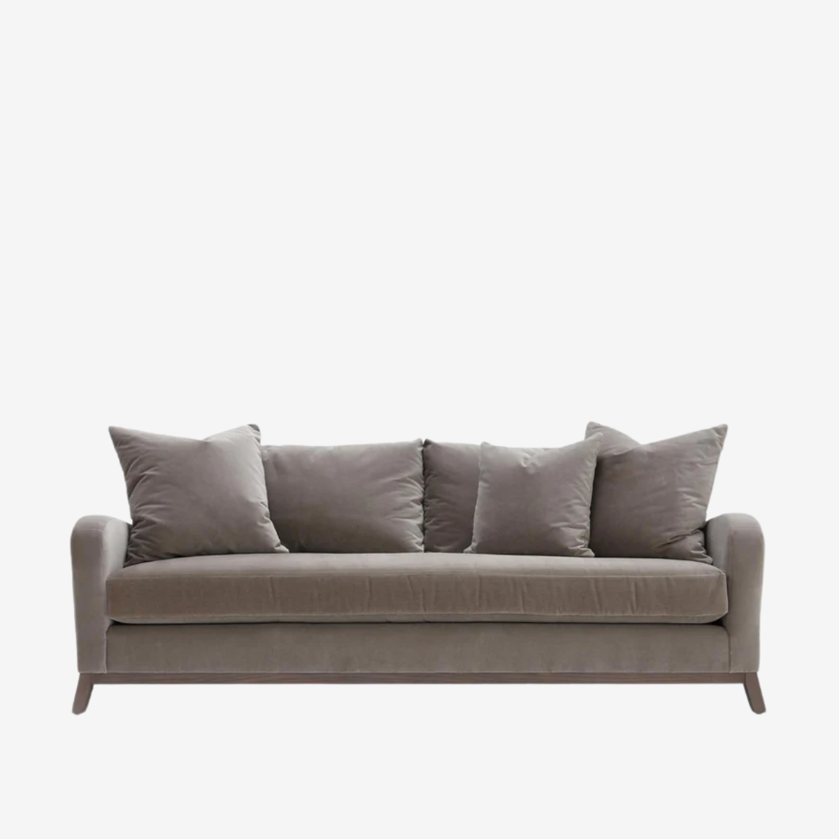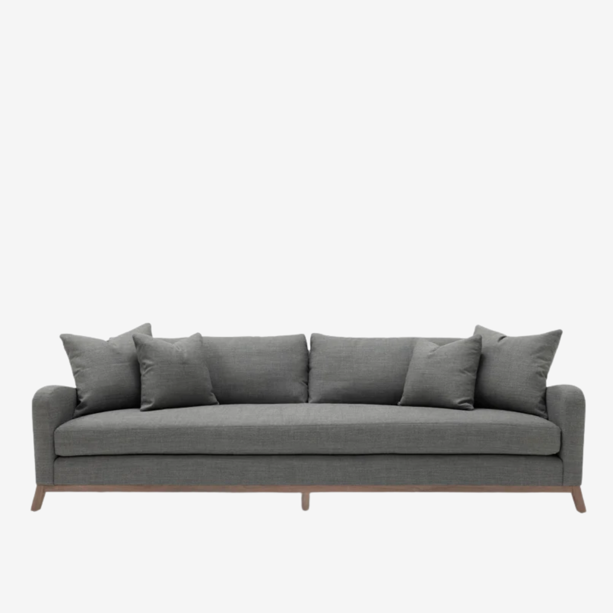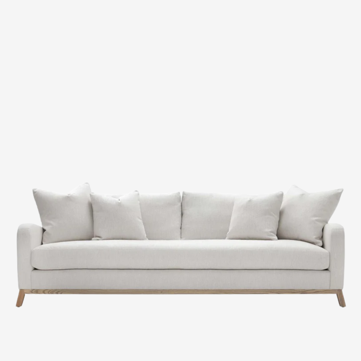 The June sofa collection features a spring down loose bench seat, boxed back pillows, and 5 1/2" H wood base.