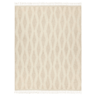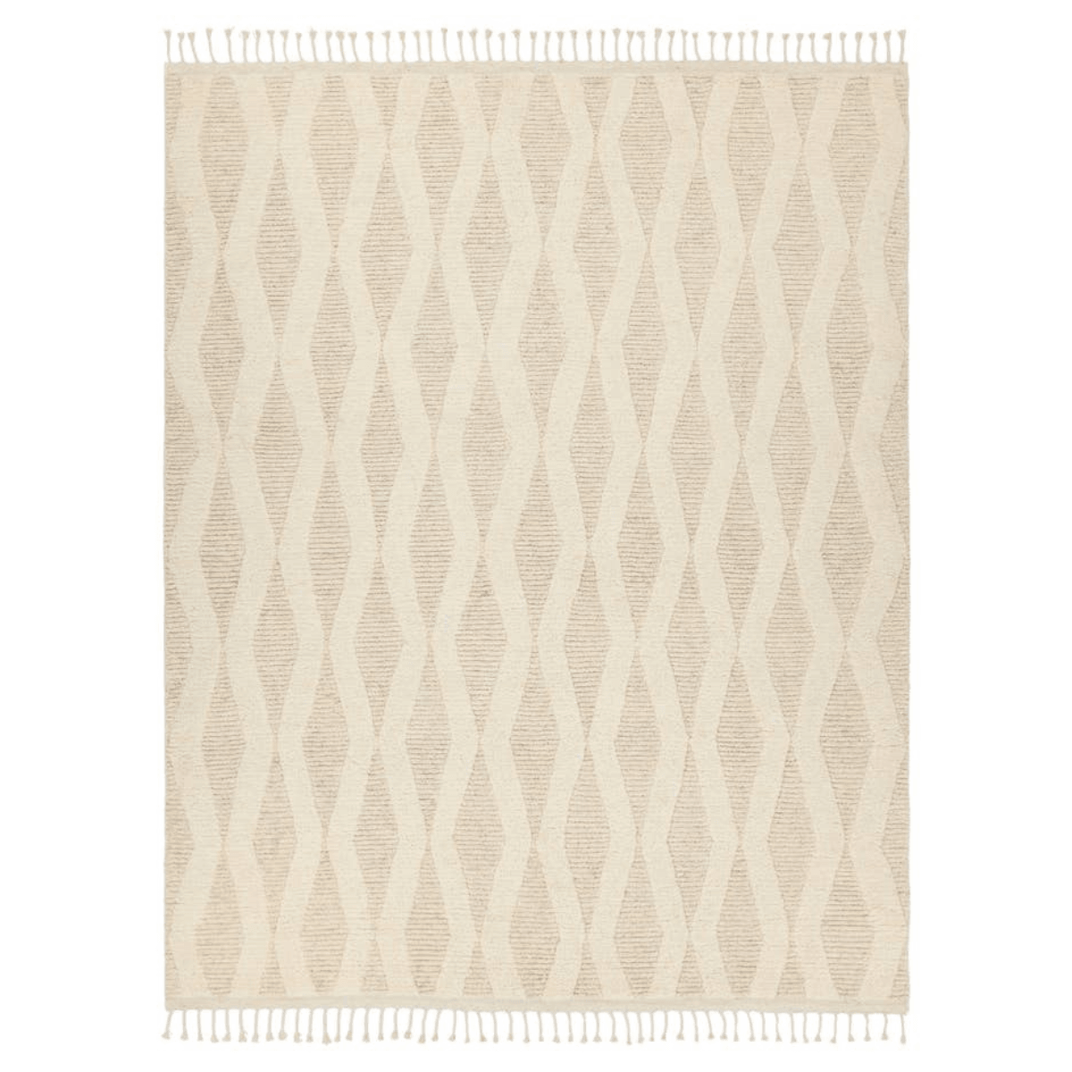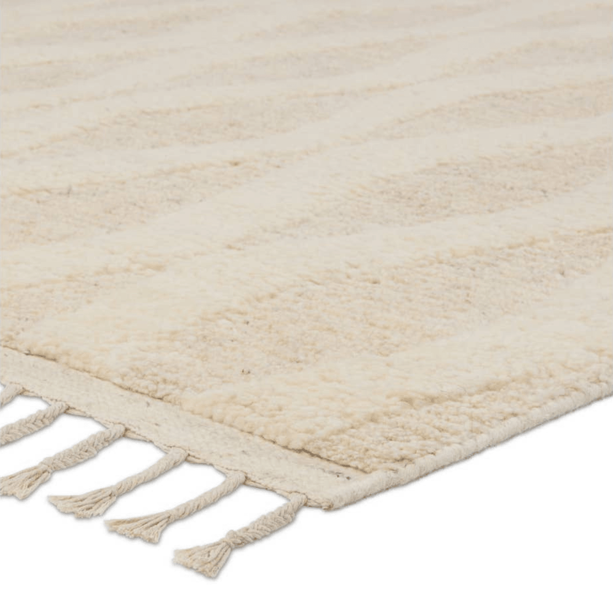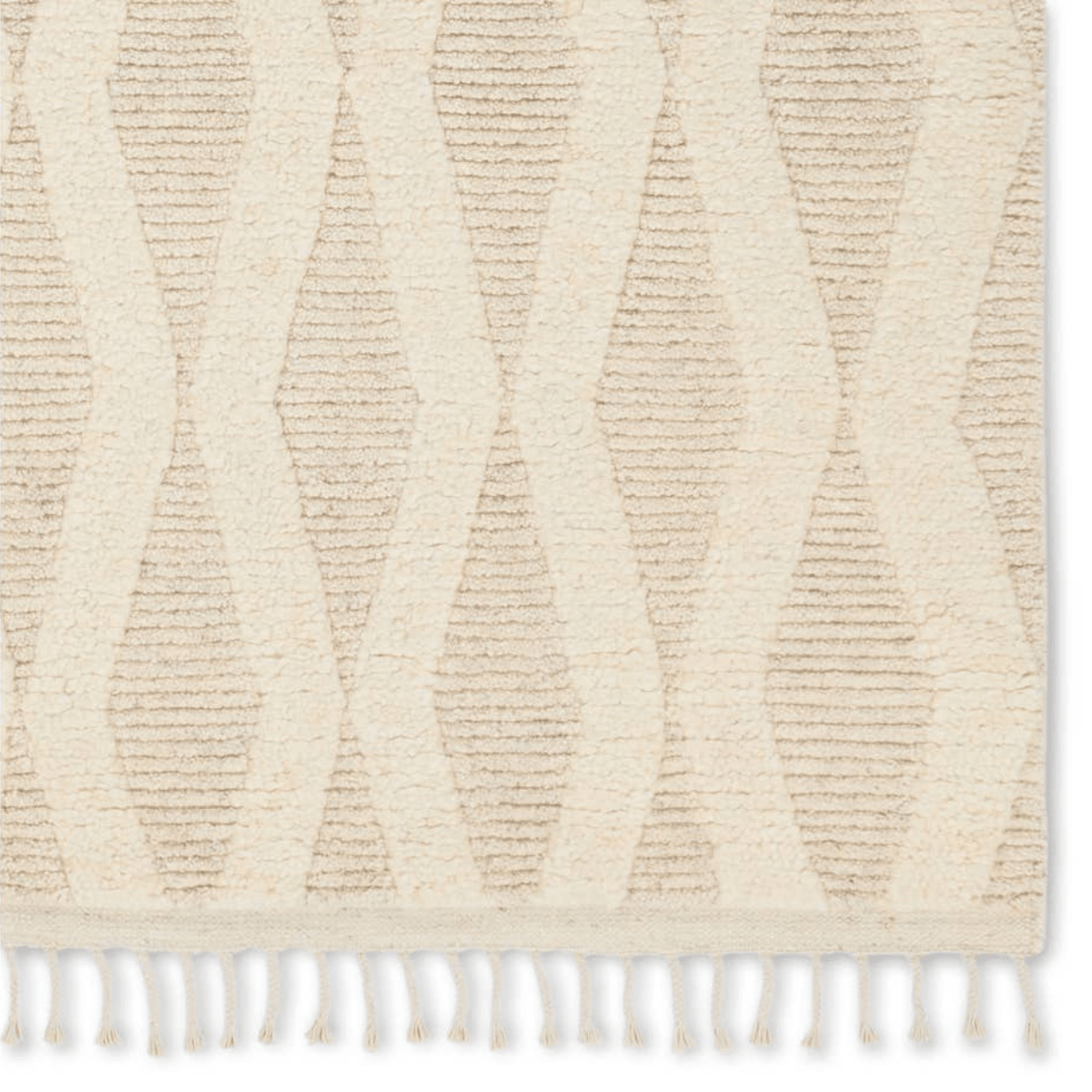 The Keoka collections boasts a fresh take on classic Afghani hand-knotted textiles. In easy-to-decorate tones of cream, the light and airy colorway of the Ela rug anchors room with versatility and neutral appeal. The texture-rich wool pile features a ribbed construction that lends unique linear details to the dynamic trellis patterns. Braided fringe accents and a black, striped flatweave border add a dose of global flair.
