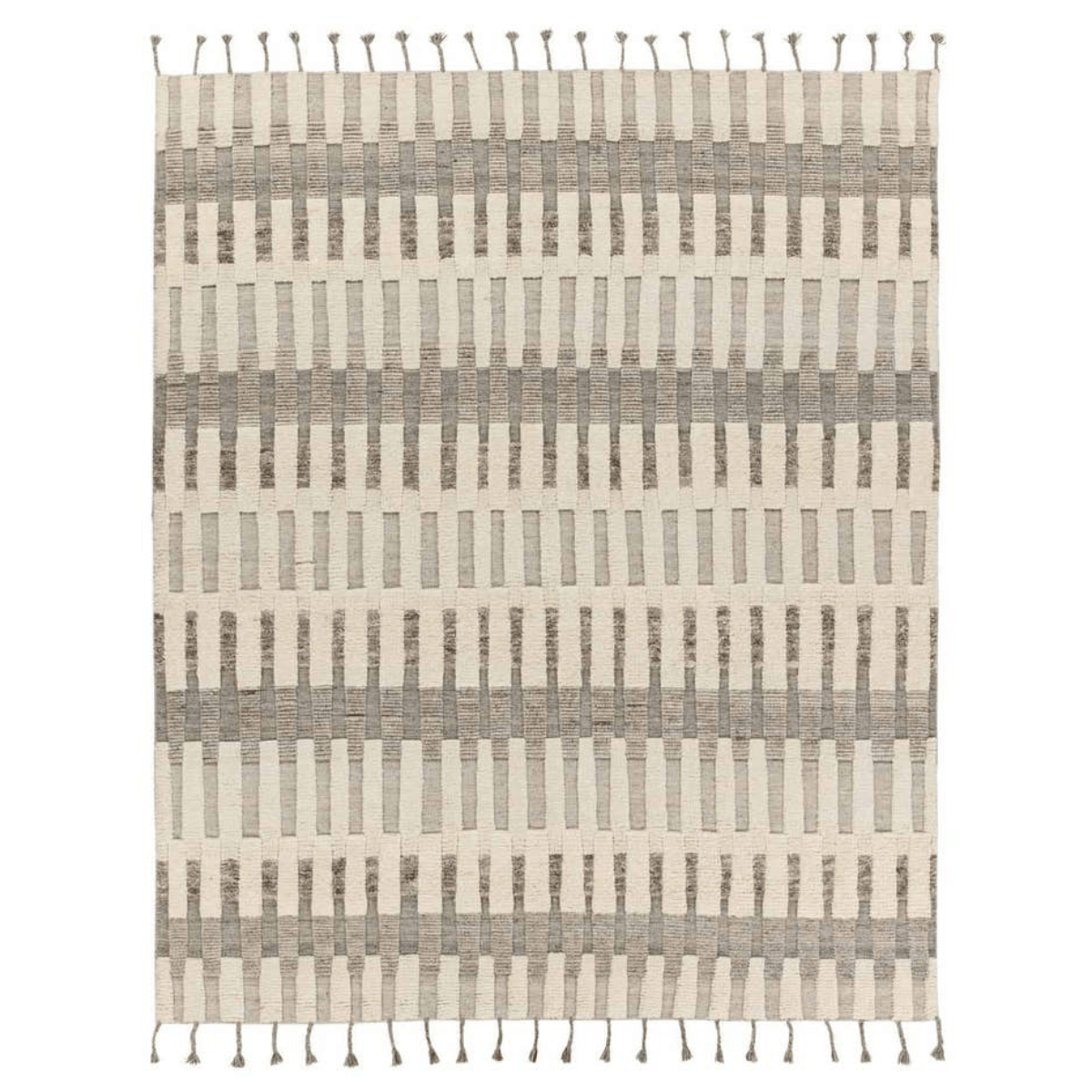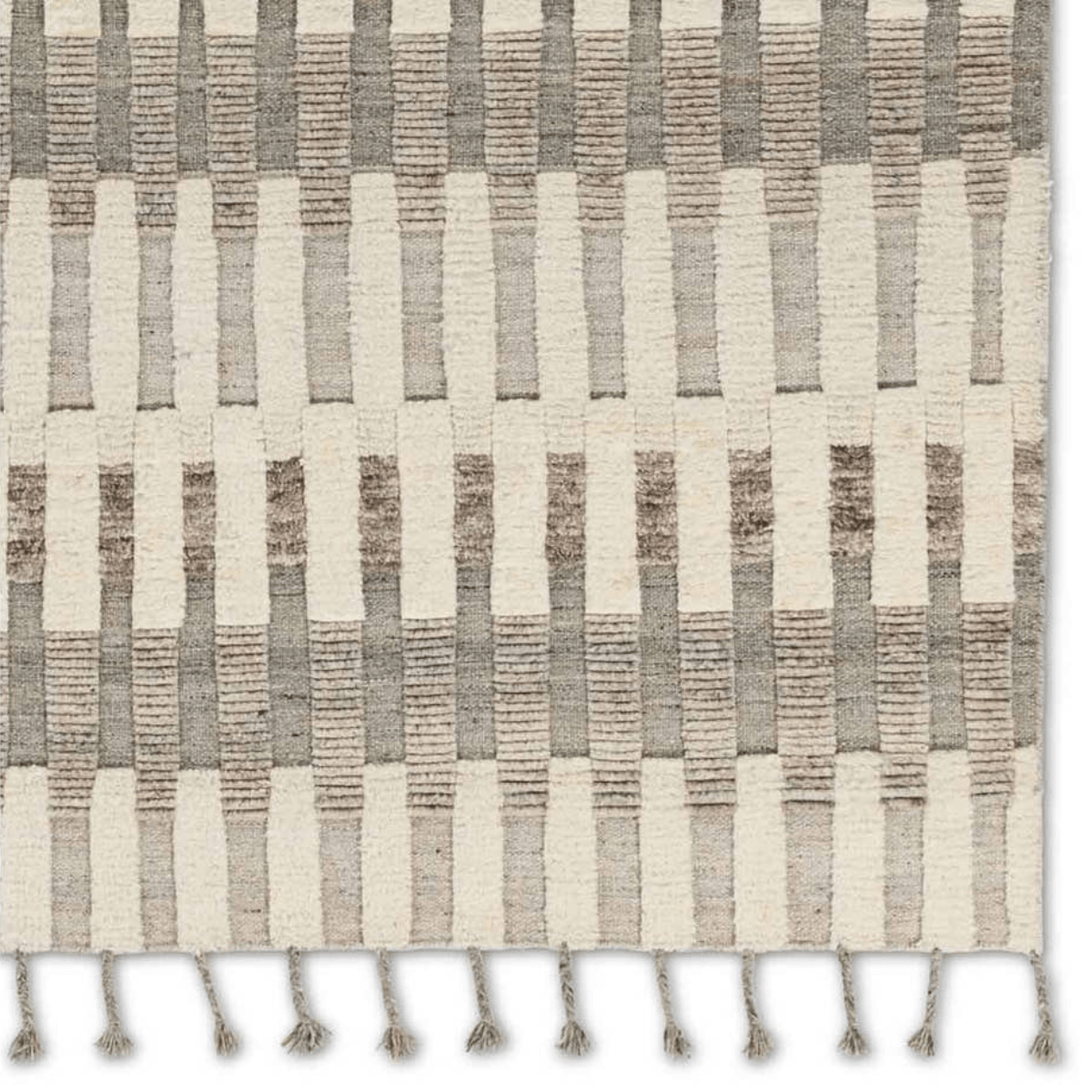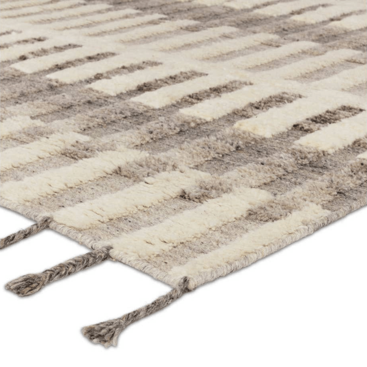 The Keoka collections boasts a fresh take on classic Afghani hand-knotted textiles. In easy-to-decorate tones of cream, taupe, and gray, the light and airy colorway of the Izza rug anchors room with versatility and neutral appeal. The texture-rich wool pile features a ribbed construction that lends unique linear details to the dynamic geometric patterns. Braided fringe accents add a dose of global flair.