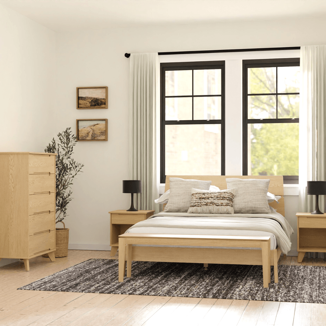 Linn is an upcycled bedroom collection, crafted with lumber that has been reclaimed from Copeland's operations. It features moderate scaling and a soft contemporary design. The Linn Bed is a platform bed, designed for a mattress only. It is perfectly complemented by attachable shelf nightstands or standalone nightstands with a drawer, and any of the collection's accompanying dressers.
