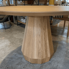 Memento is a modern and elegant collection for the dining room. Joël Dupras reinvented the round table by creating a central pillar made up of 24 white oak panels, assembled with mortar and tenon joints and reminiscent of an oak barrel.