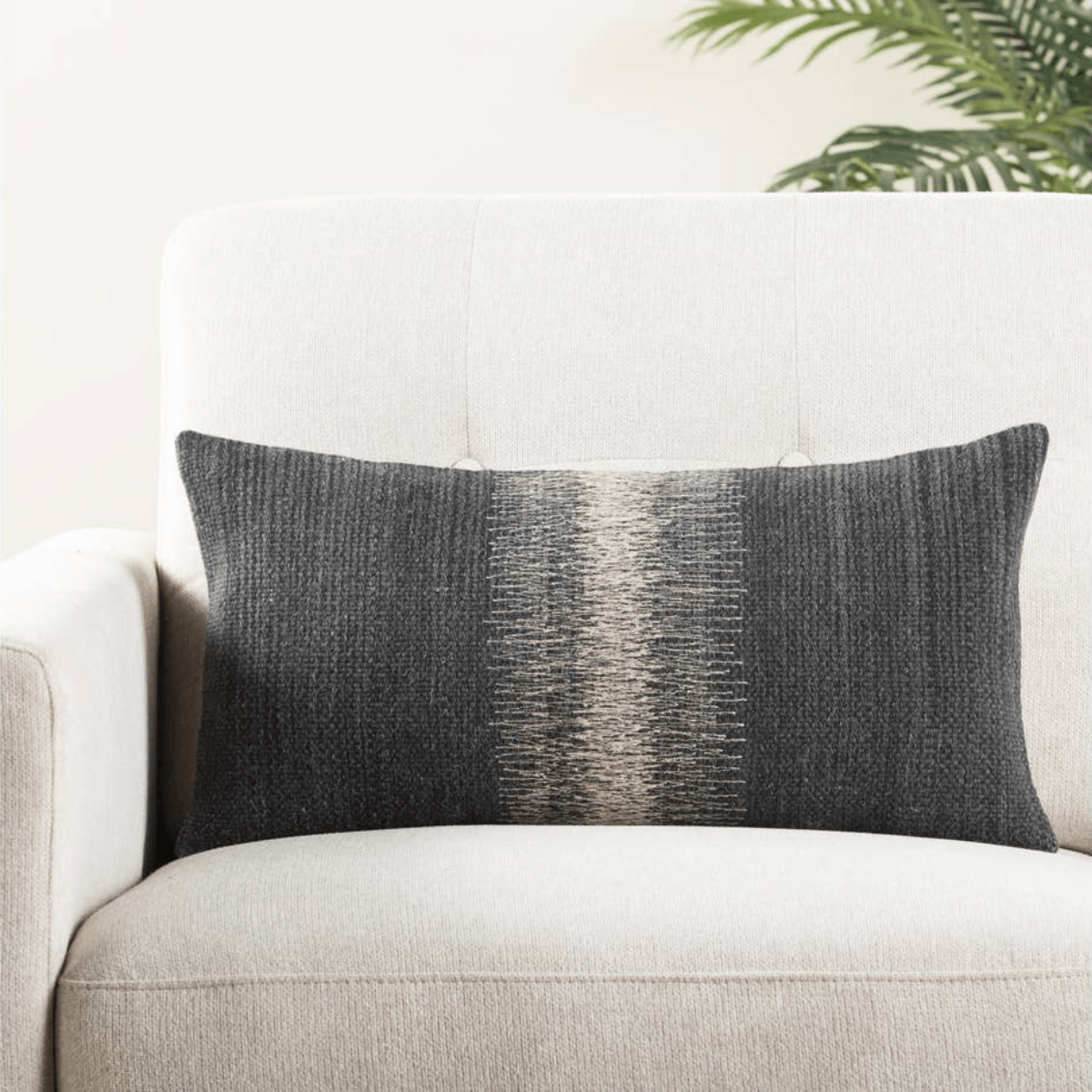 The Mercado pillow collection marries bohemian charm and irresistible texture. The Aravalli lumbar pillow is crafted of wool and cotton, featuring a dynamically embroidered linear design in tones of black and ivory. This plush accent lends a neutral, rustic look to any style space.