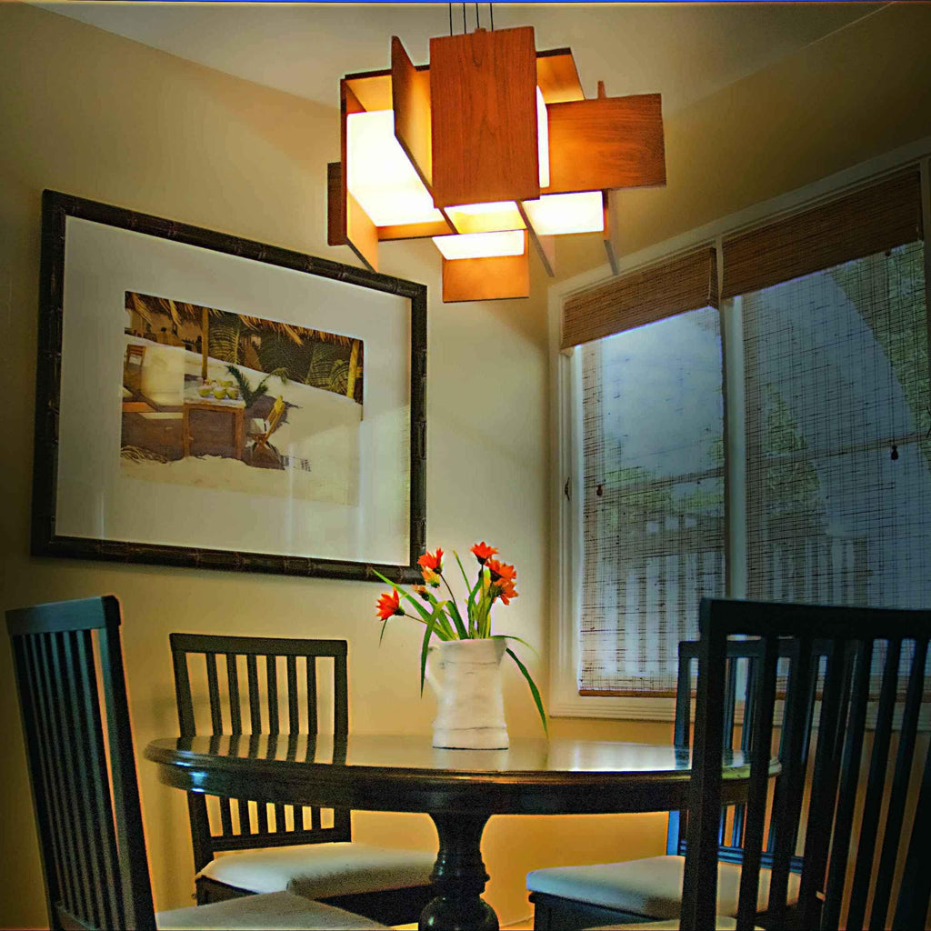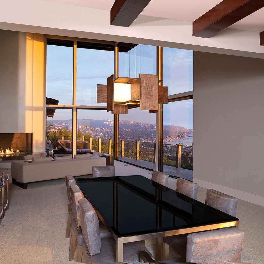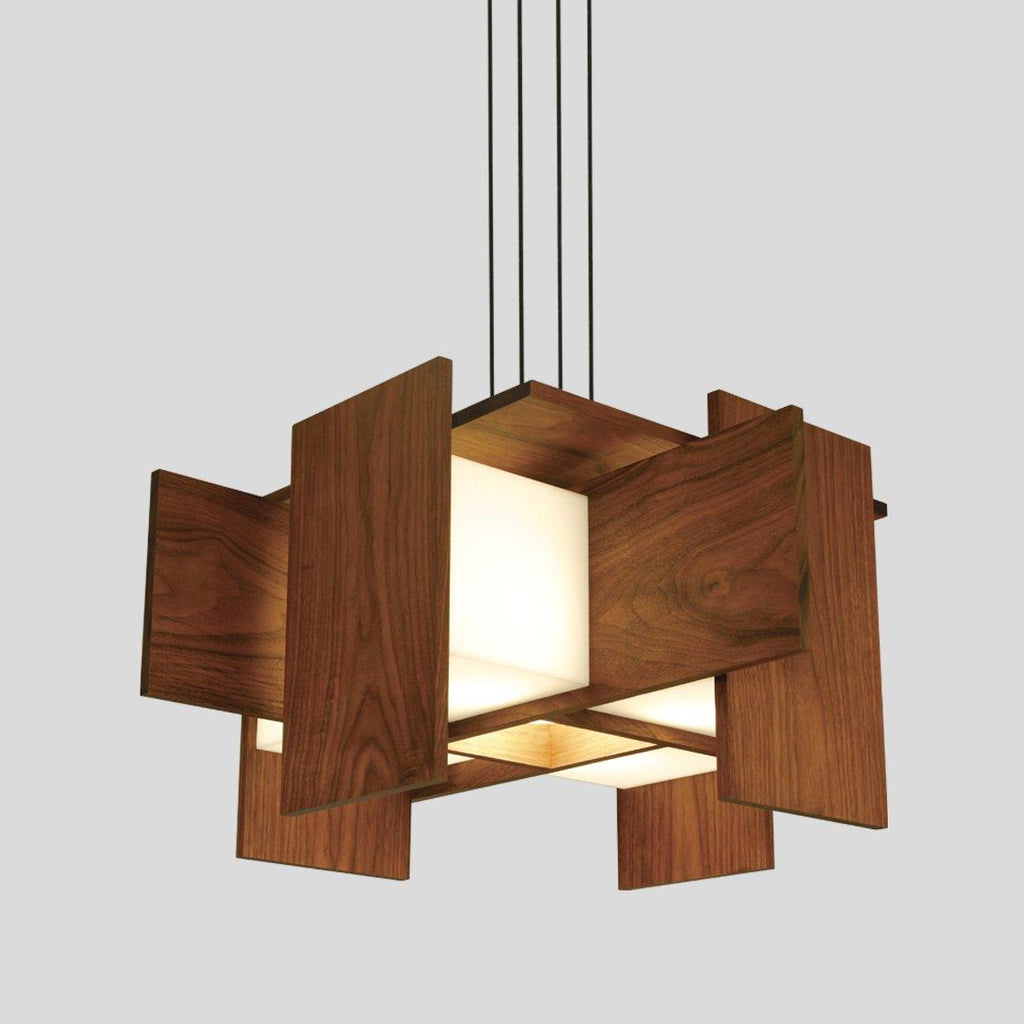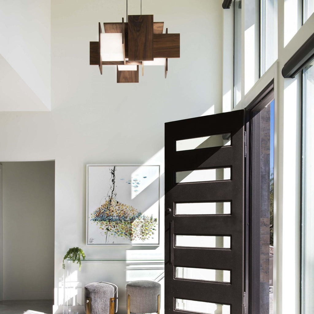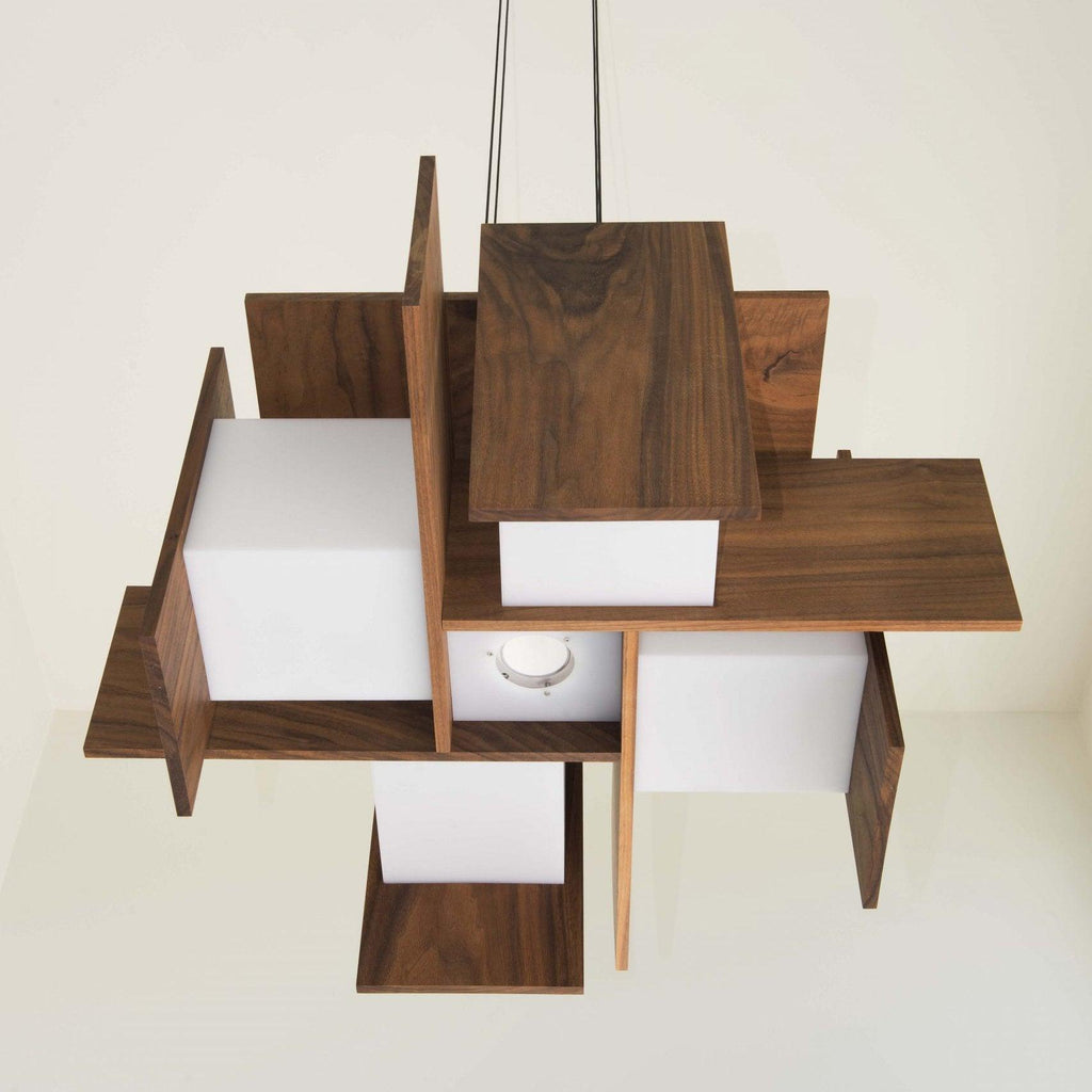 The way the walnut planes in the Muto both block and bounce light makes for a very dynamic composition of light and shadow, from any vantage point. While the pinwheel form with its repeating elements is symmetric, it appears very sculptural from any one view. The modern floating ideal is realized in the Muto. By holding each walnut element away from its neighbor, so each plane floats, the whole fixture feels weighless as if it were floating itself.