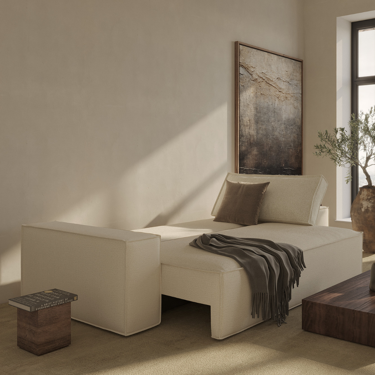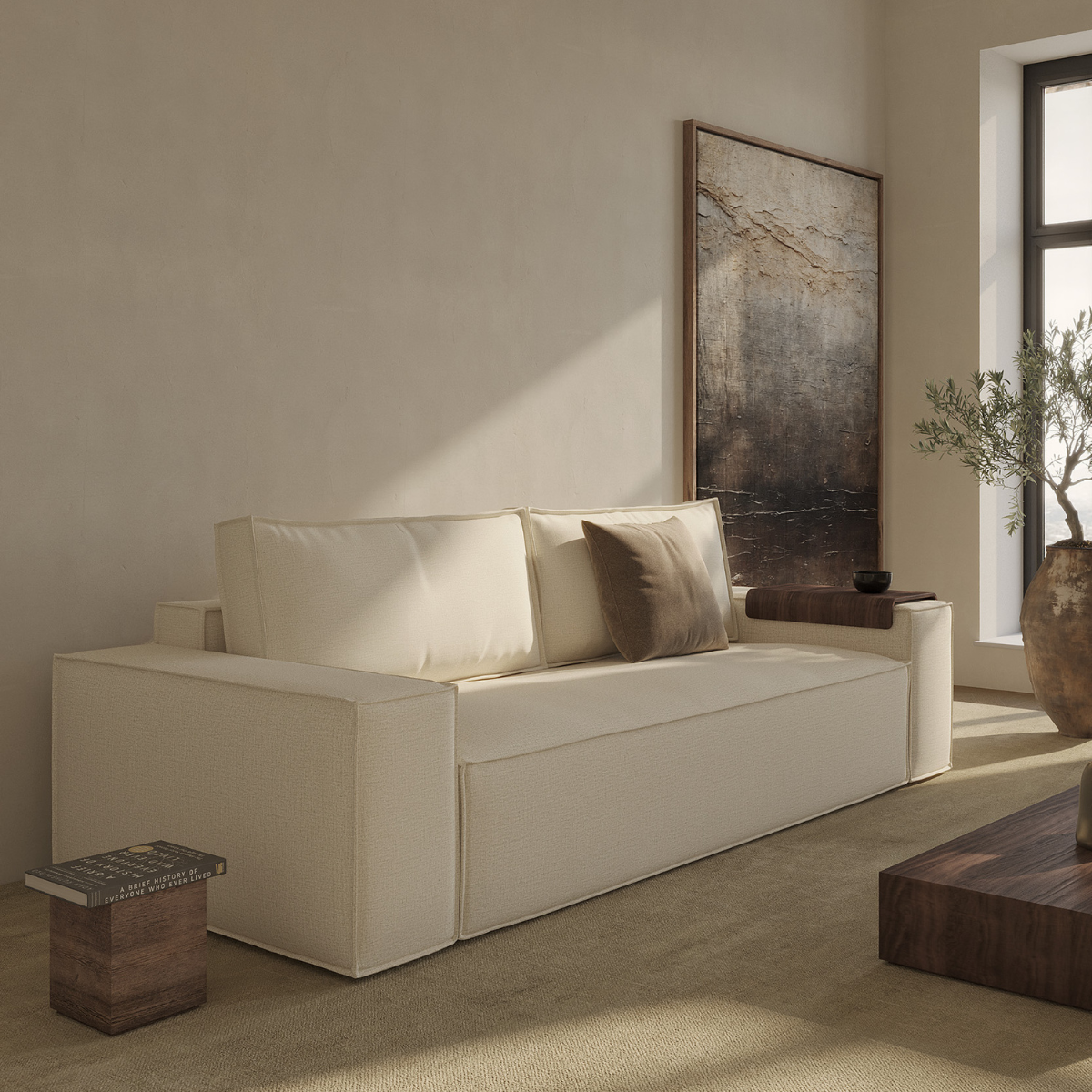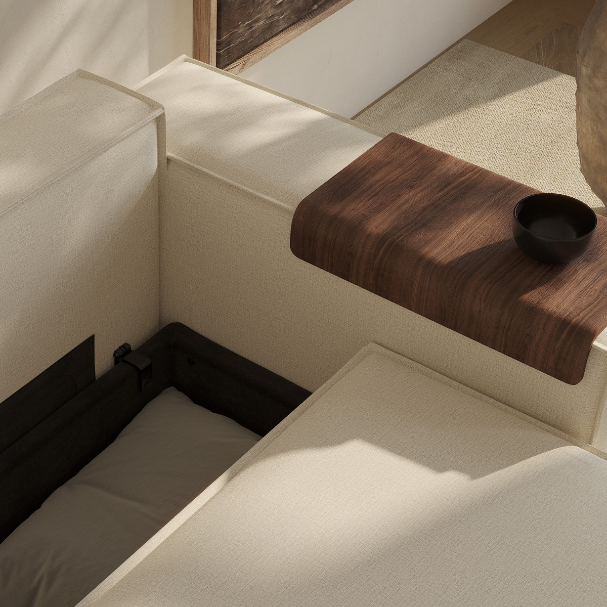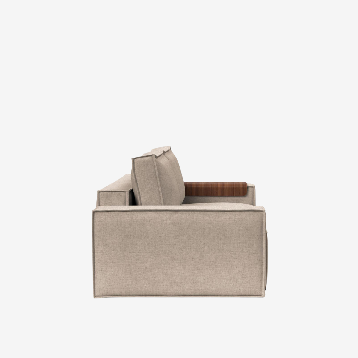 The Newilla sofa bed with wide arm is the perfect choice for working in the most comfortable way. Choosing the walnut wood tray alongside it turns the armrest into a versatile replacement for a side table. Newilla features a large storage space, and can easily be transformed into a spacious bed for two. The detachable and washable covers ensure a long product life cycle, and the possibility to change the fabric of the sofa.