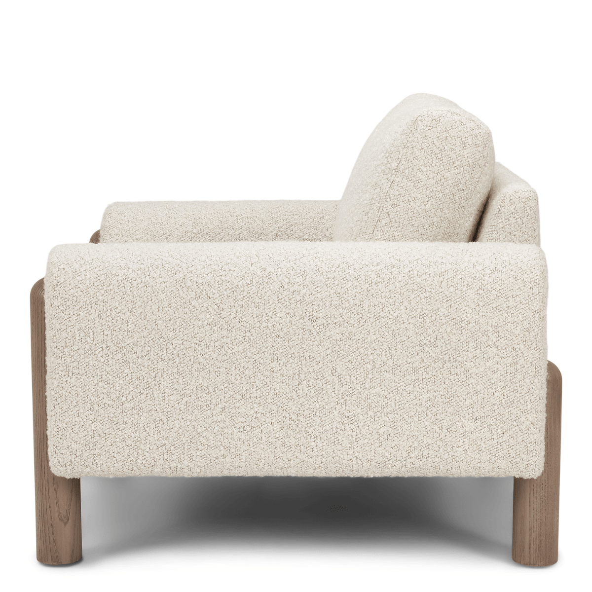 Broad rolling arms bookend a loose back seat ideal for curling in. This sturdy frame beautifully captures the architectural monoliths that inspired it.