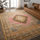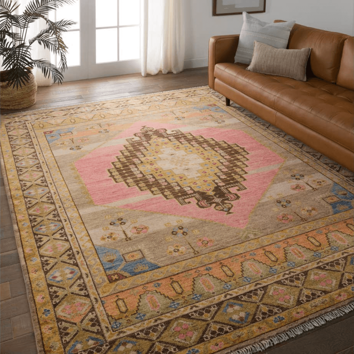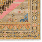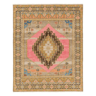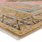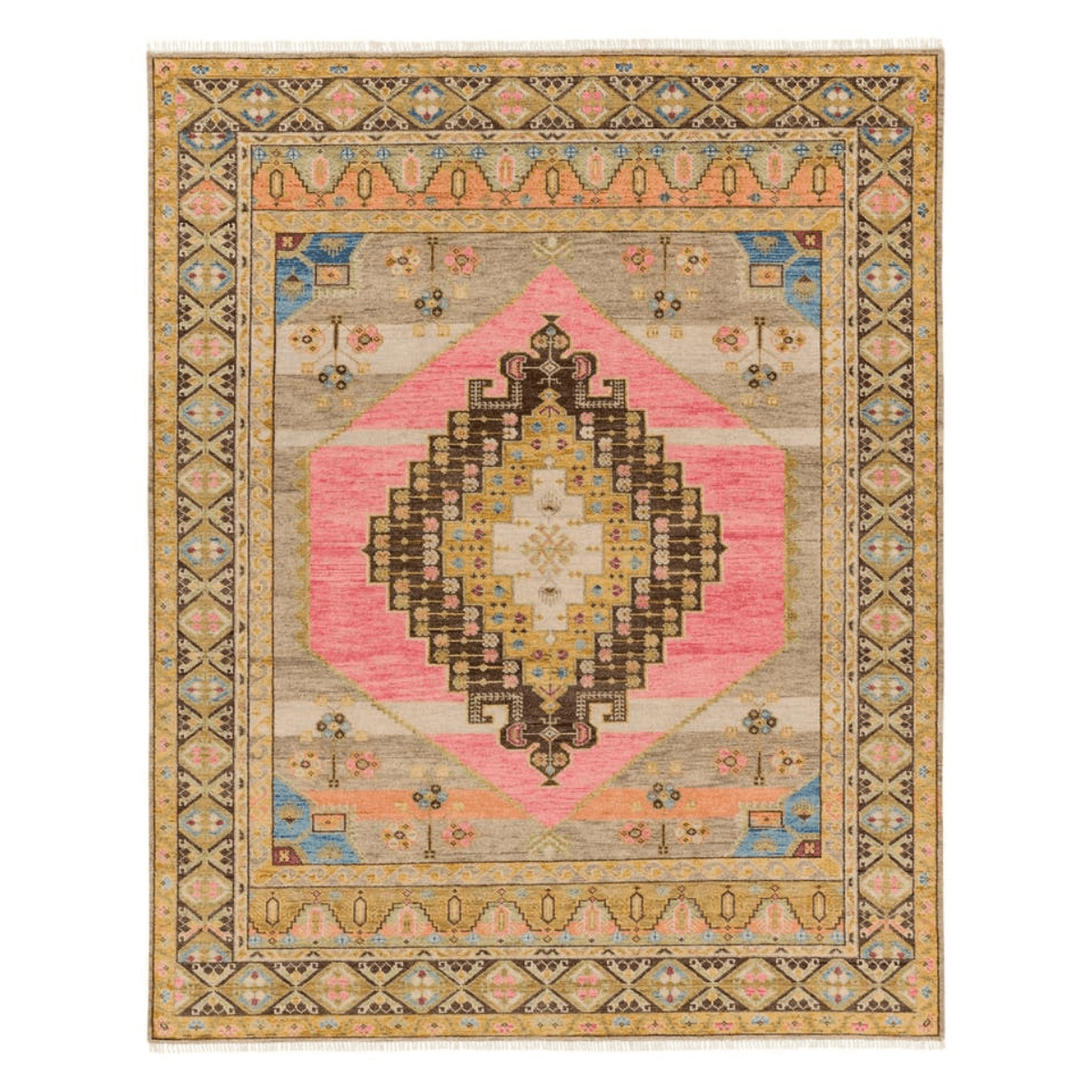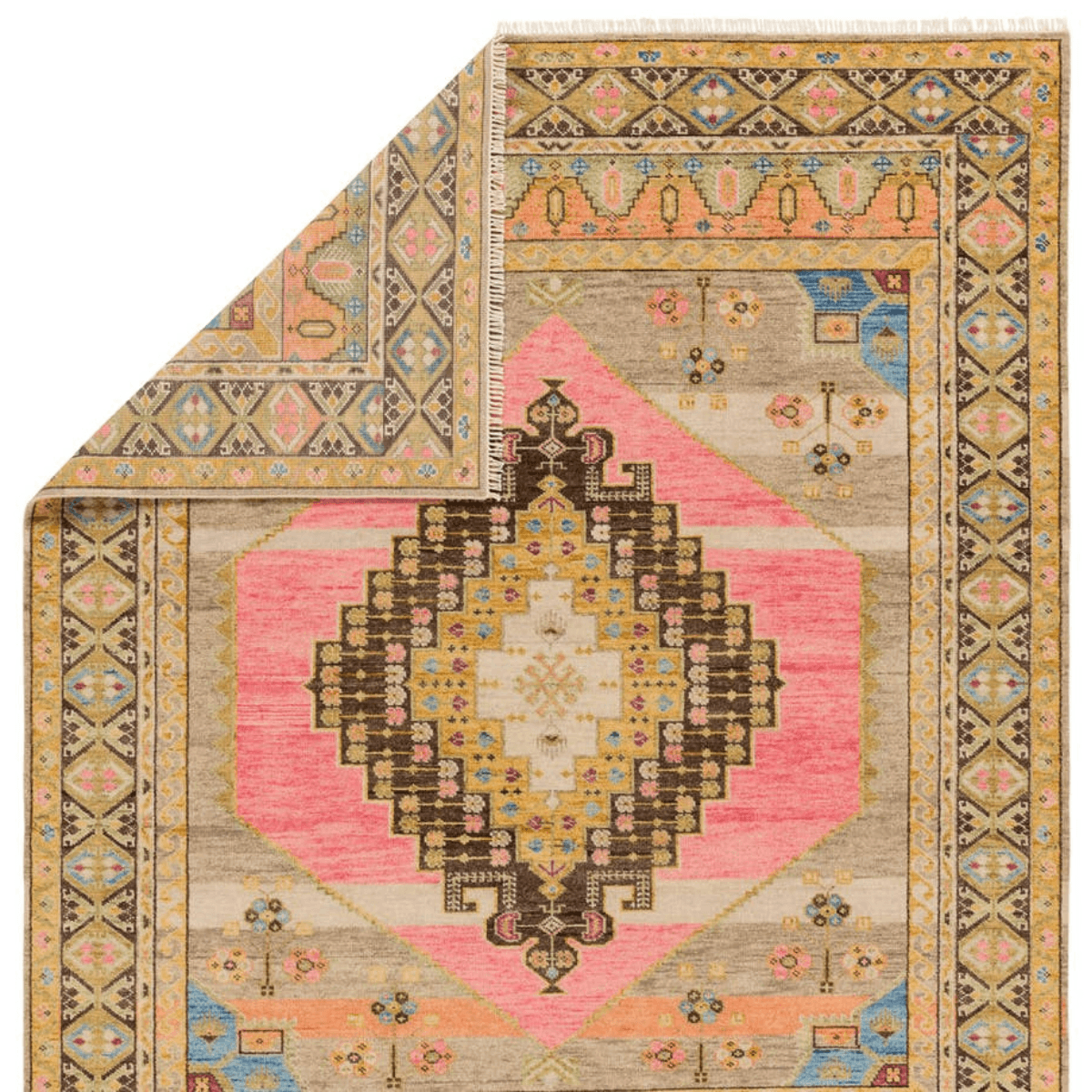 The eye-catching and boldly colored Reza collection features an assortment of Turkish-inspired designs that emulate the unique bazaar finds overseas. These handknotted designs boast a 100% wool construction for heirloom-quality durability. The lively Izma rug features a medallion and intricate border in hues of pink, green, gold, blue, peach, gray, and cream. The low pile creates an easy-to-clean accent piece that thrives in both high and low traffic areas of the home.