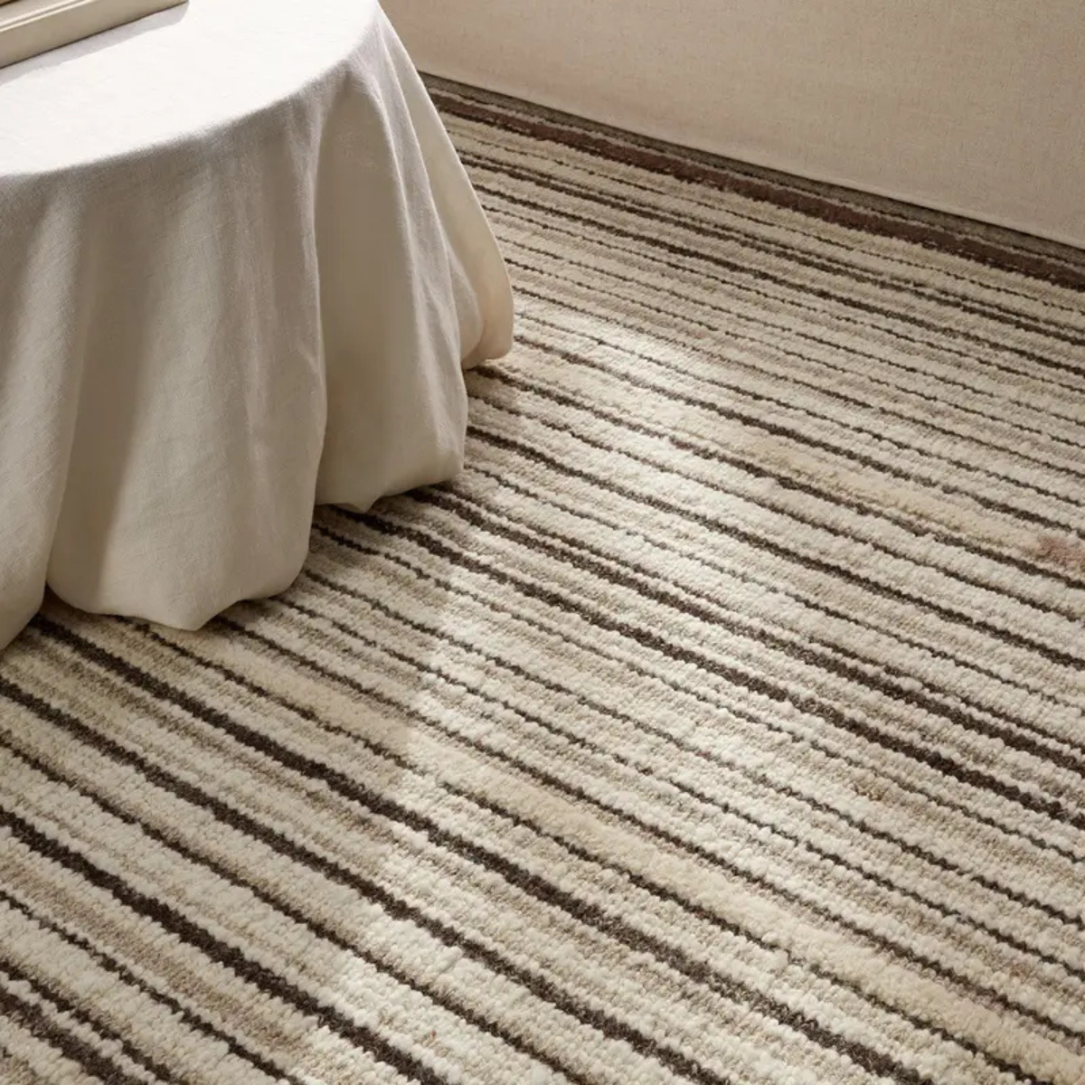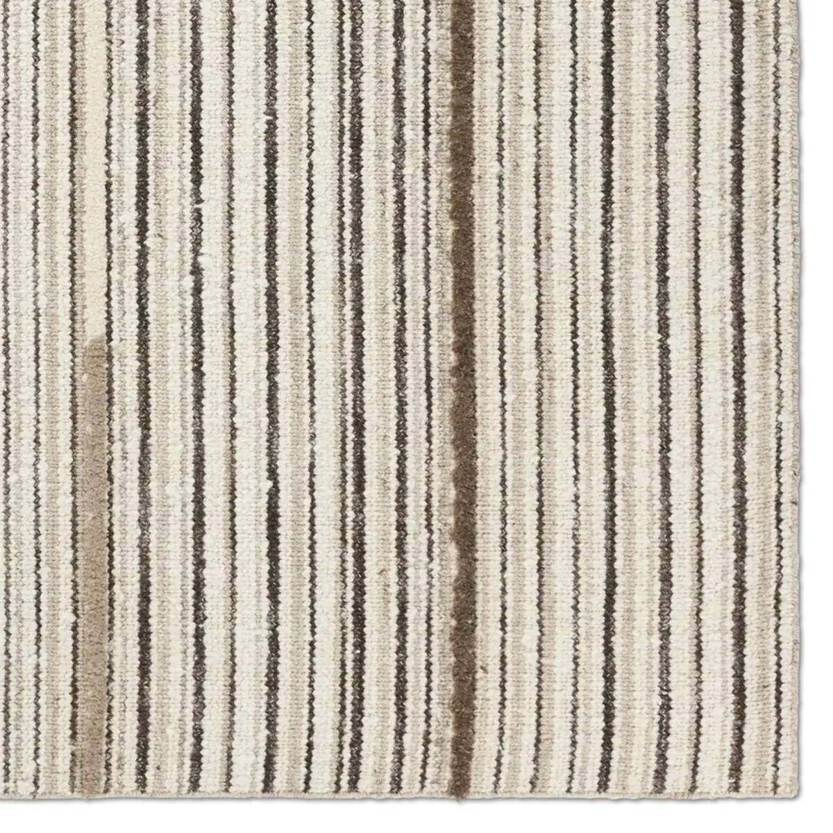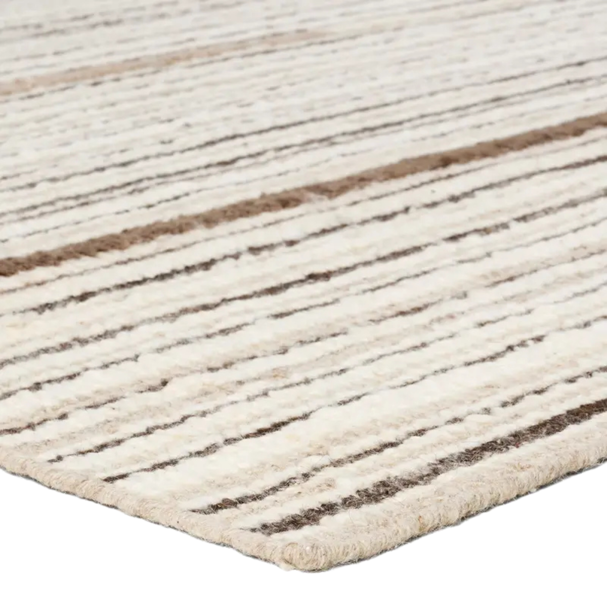 Earthy tan, beige, and brown tones come together in a mesmerizing linear design, infusing the Quaint rug with contemporary elegance. Handwoven from a luxe wool pile, its luminous sheen highlights every intricate detail.