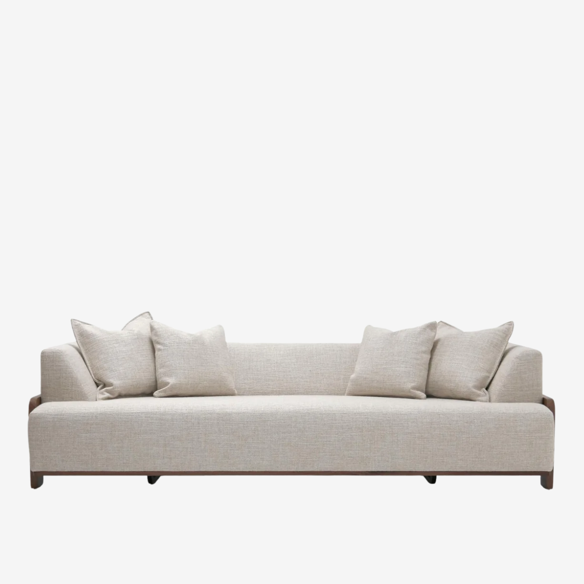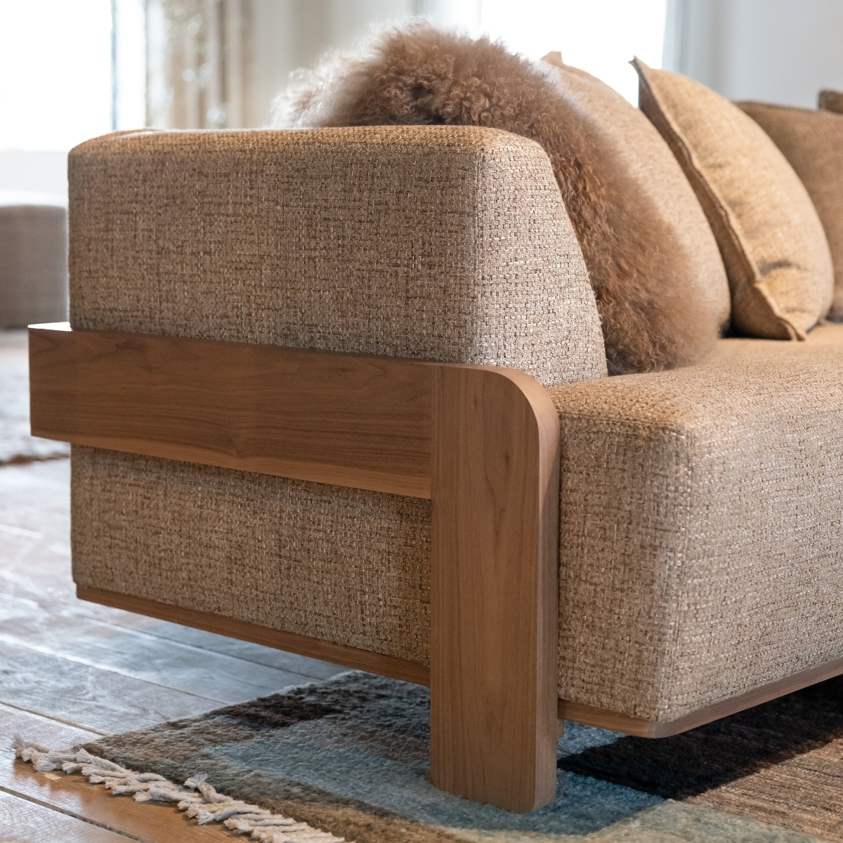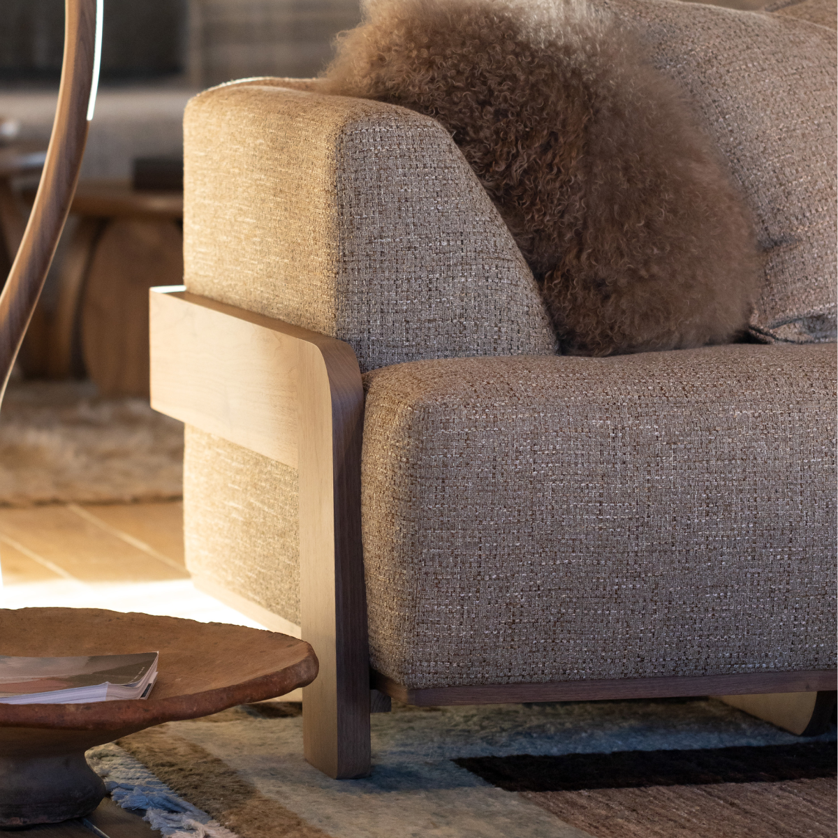 The Rowan sofa collection features a sleek, low-profile design with rounded edges, a sculpted tight seat and backrest, and distinctive exposed wooden accent along the base and sides.