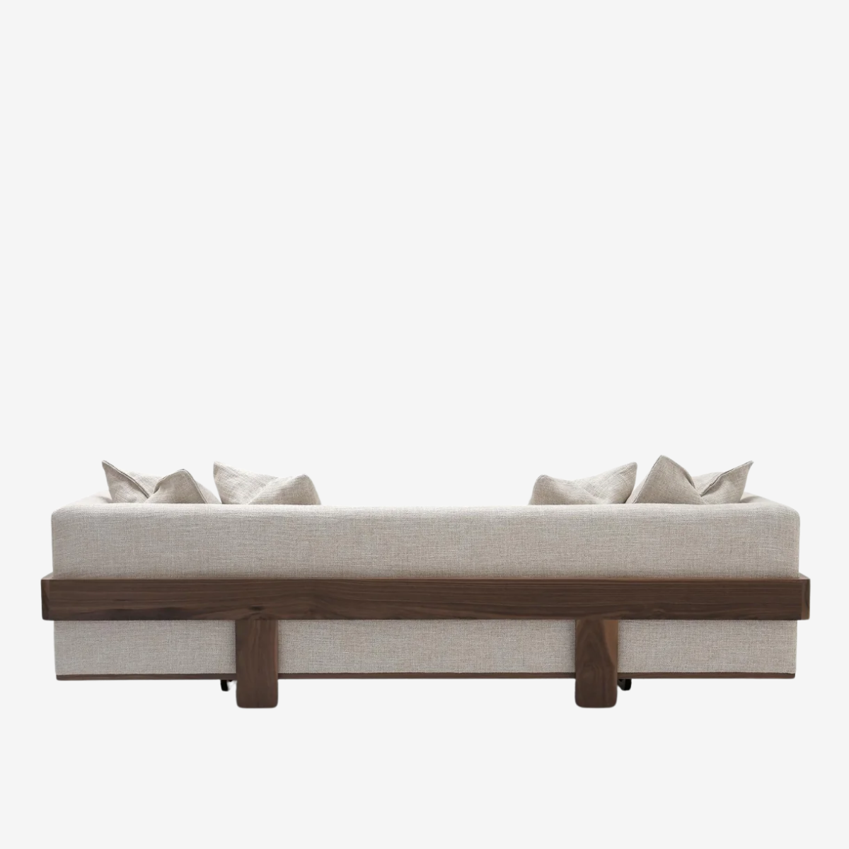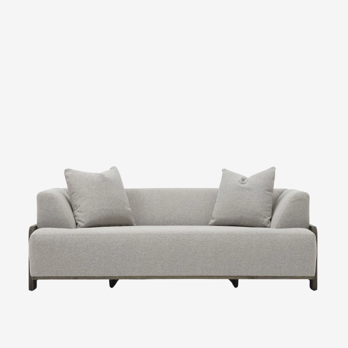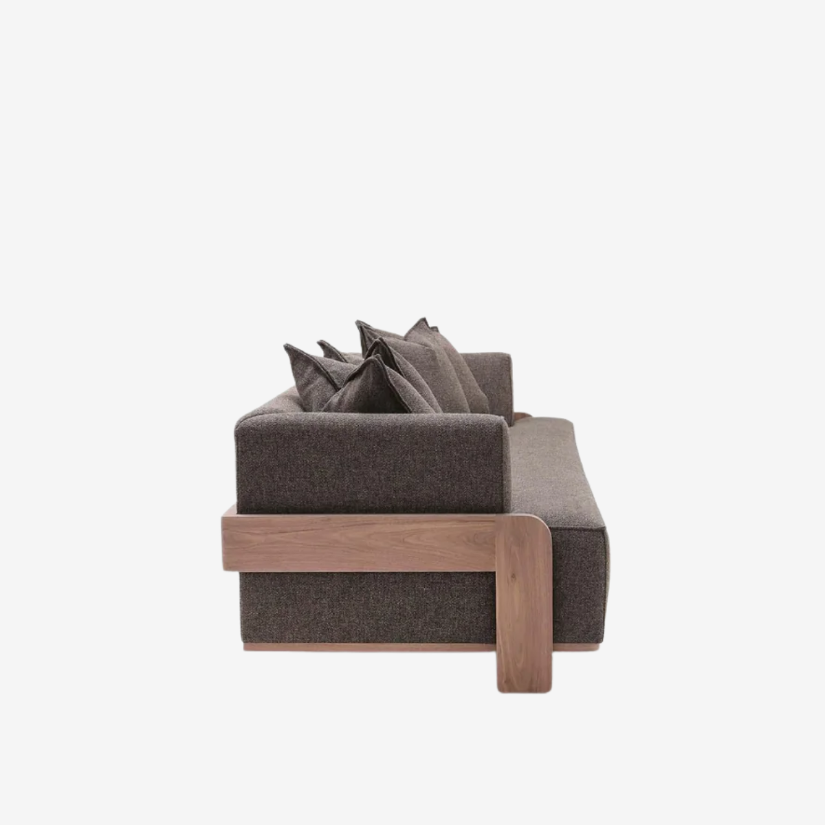 The Rowan sofa collection features a sleek, low-profile design with rounded edges, a sculpted tight seat and backrest, and distinctive exposed wooden accent along the base and sides.