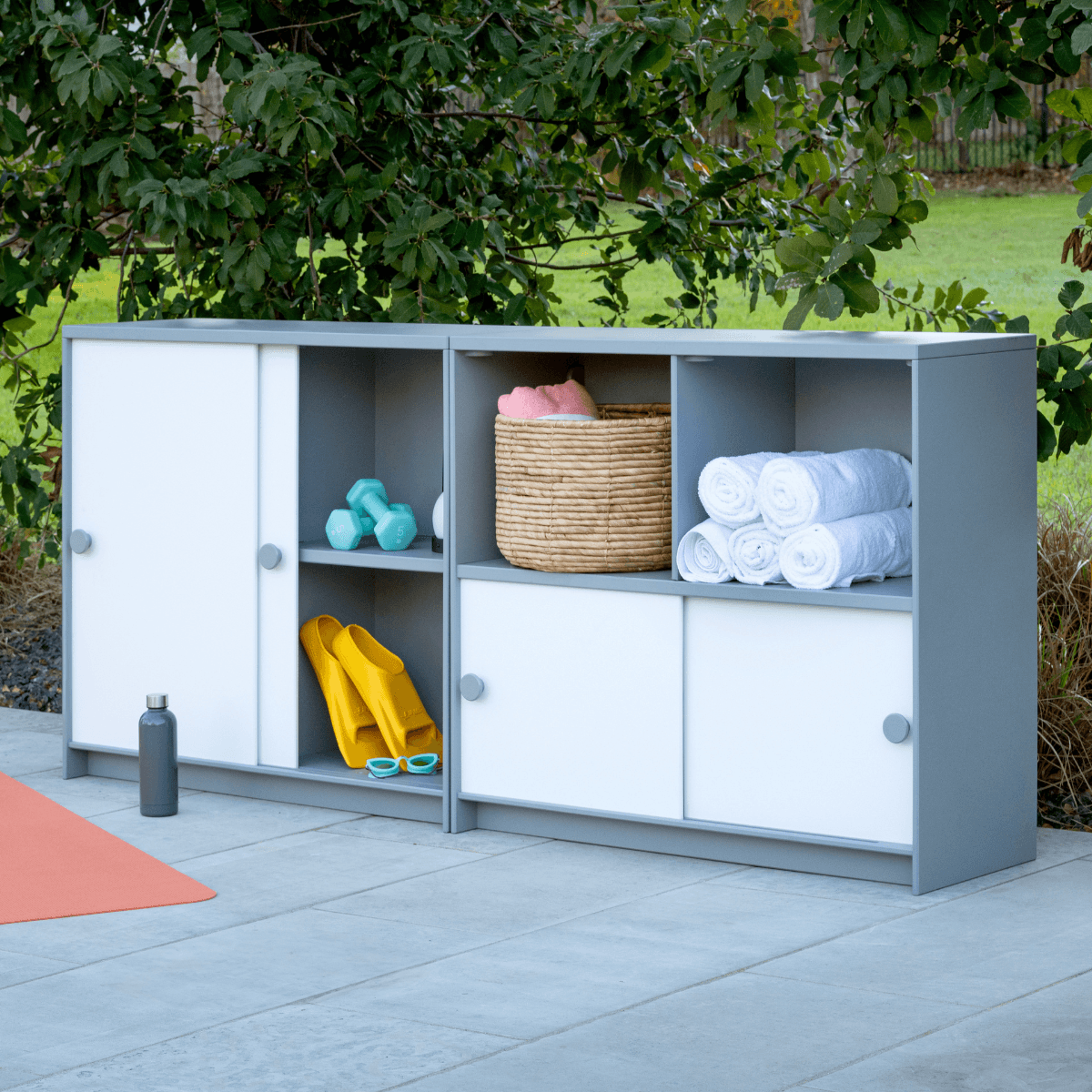 Less mess means less stress and more time for lollygagging. Maintaining an orderly outdoor space, mudroom, entryway, or garage has never been easier with the Slider Cabinet! Choose between monochromatic for a simple and sophisticated look or a colored frame with white doors for an eye-catching contrast. The Slider Cabinet looks great on its own, but you can further increase your stowing power by positioning it side-by-side or back-to-back with the Slider Cubby Cabinet, Cubby, or another Slider Cabinet for storage customized to your needs.