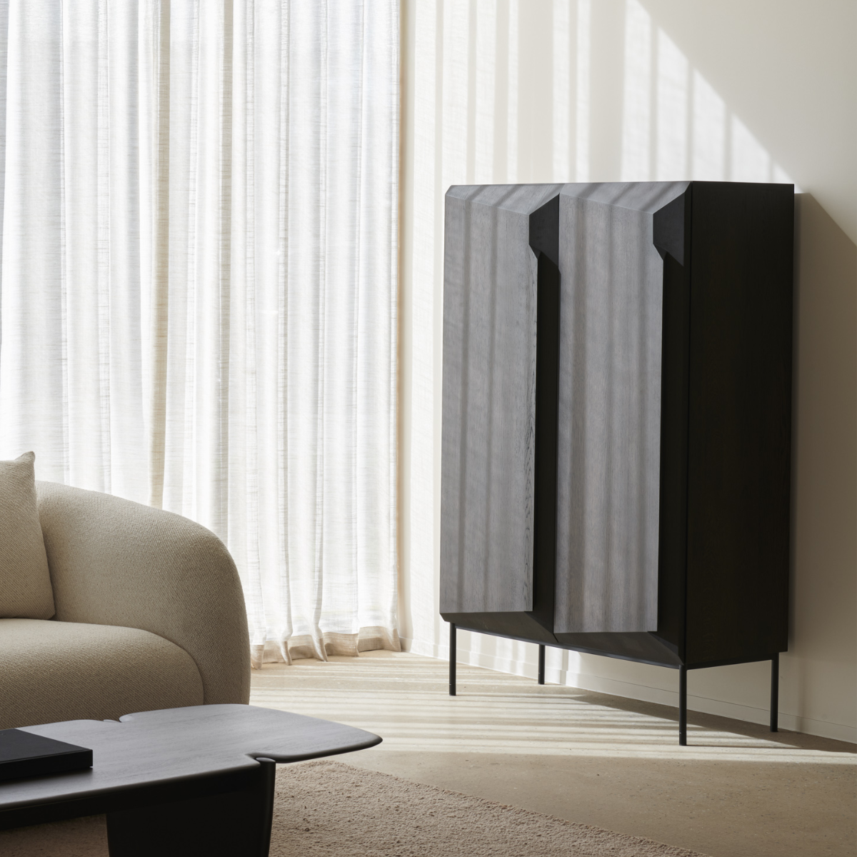 An angular composition, designed by Alain van Havre, forms the heart of a design that aims to distance itself from traditional static and immobile surfaces. A unique sense of volume is created, which alters your perception of the cupboard as you walk by.